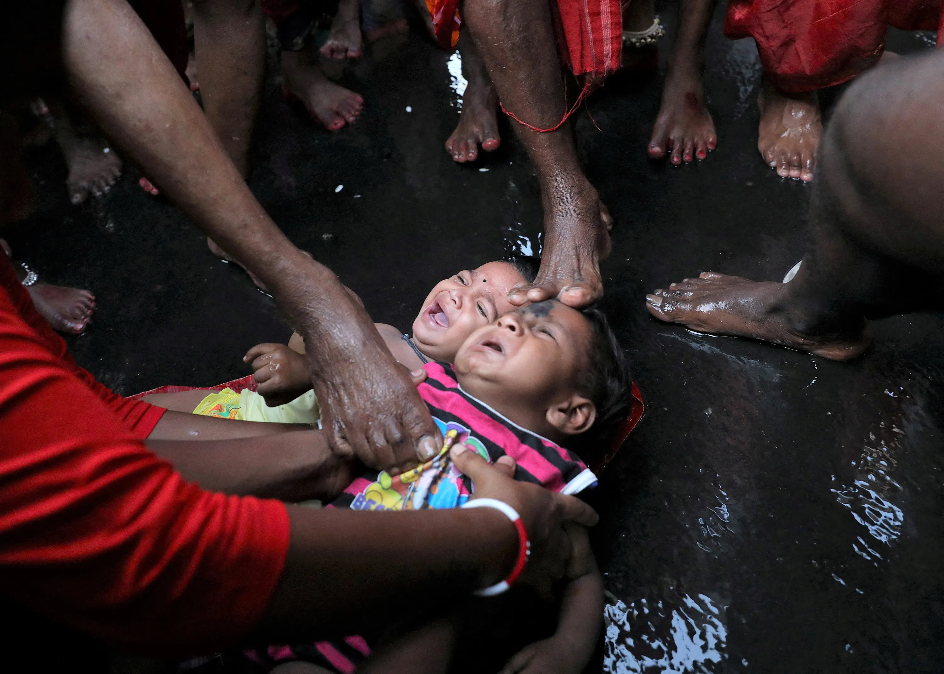 Hindu devotees touch infants with their feet as part of a ritual to bless them during a religious procession held to mark the Gajan festival in Kolkata, India, April 13, 2022. (Photo by Rupak De Chowdhuri/Reuters)