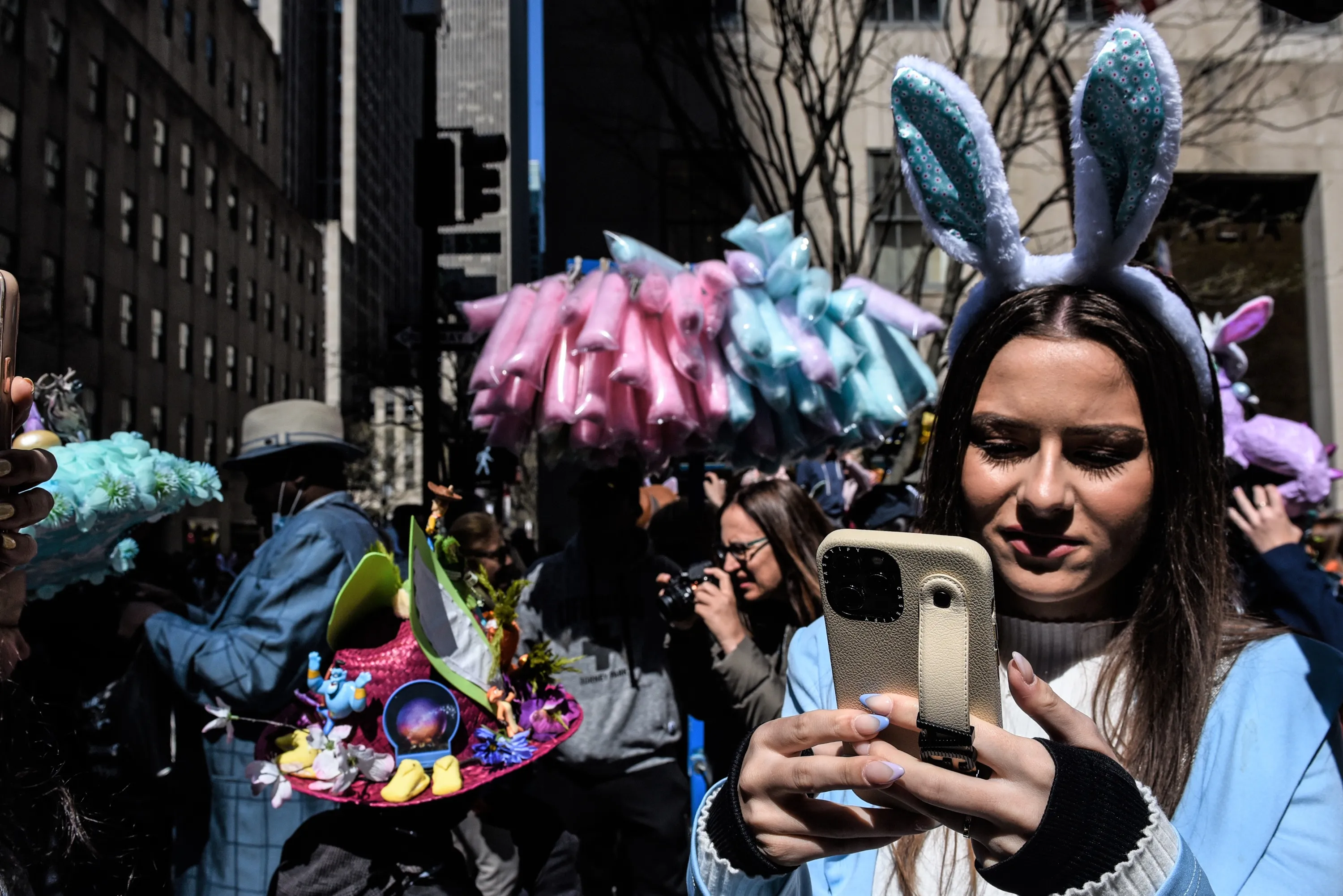 People participate in the Easter Bonnet Parade along 5th Ave. in front of St. Patrick's Cathedral on April 17, 2022 in the borough of Manhattan in New York City. The Easter Bonnet Parade is an annual festival dating from the 1870s that has been on hiatus since the beginning of the COVID-19 pandemic but was celebrated with a large crowd this year. (Photo by Stephanie Keith/Getty Images)
