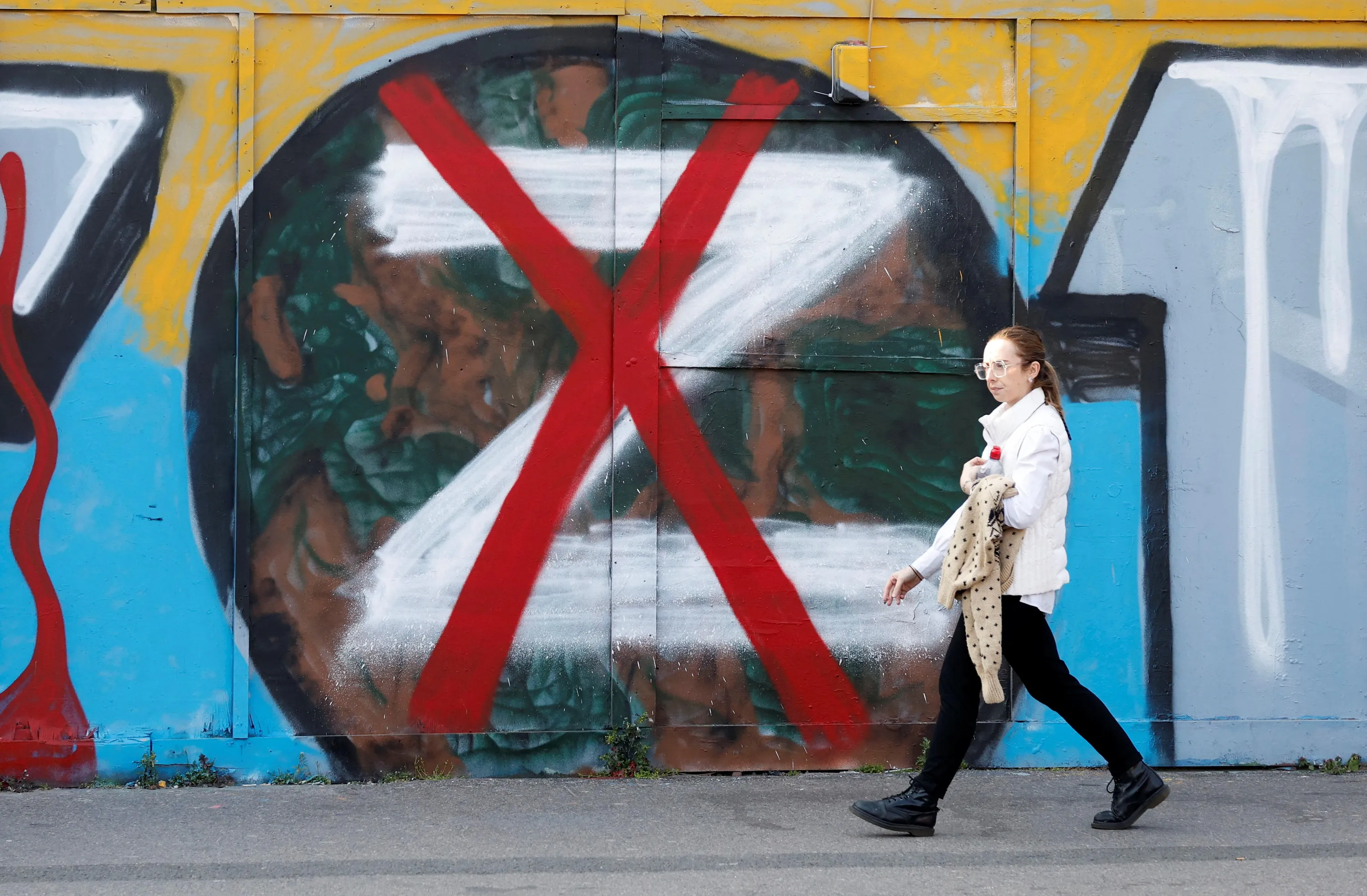 A woman walks past artwork in support of Ukraine, as Russia's invasion of Ukraine continues, London, Britain, March 24, 2022. (Photo by Peter Cziborra/Reuters)