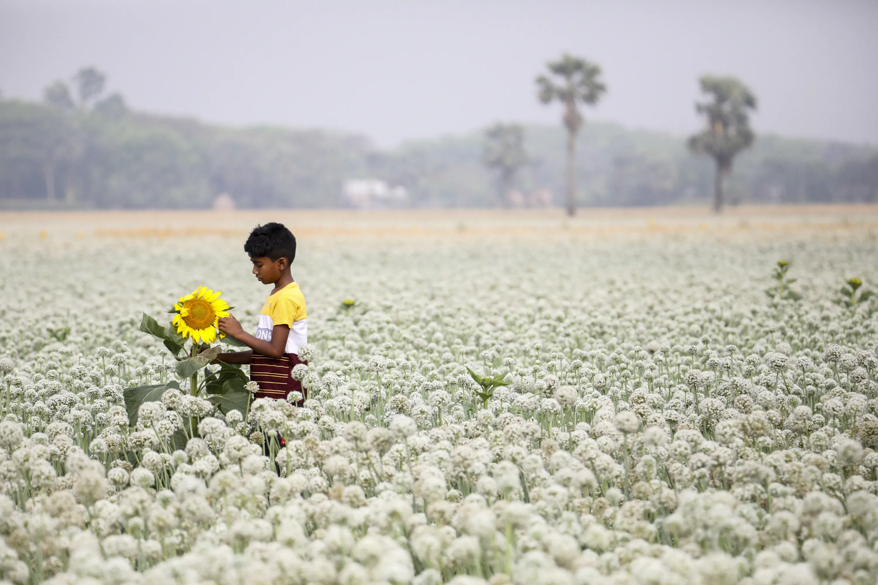 A child plays inside the onion field on March 25, 2022, 120 km from Dhaka, Bangladesh. Sahida Begum, 44, accomplished remarkable features attaining a profit of Tk crore selling onion seeds. This acquisition did not come in a day, from 2004 when she took up onion seed cultivation on 20 decimals of land, and she got only two maunds which she sold for Tk 80,000. Next year it was 13 mounds, and she earned around Tk. 5.2 lac., and the next year she took lease of more land and attained 32 maunds and this practice continued for the following years. Many young men and women are being interested in cultivating onion seeds seeing Shahida Begum's work, she is an idol in her areas. Shahida Begum grabs many national awards for her contributions. (Photo by Zakir Hossain Chowdhury/Anadolu Agency via Getty Images)
