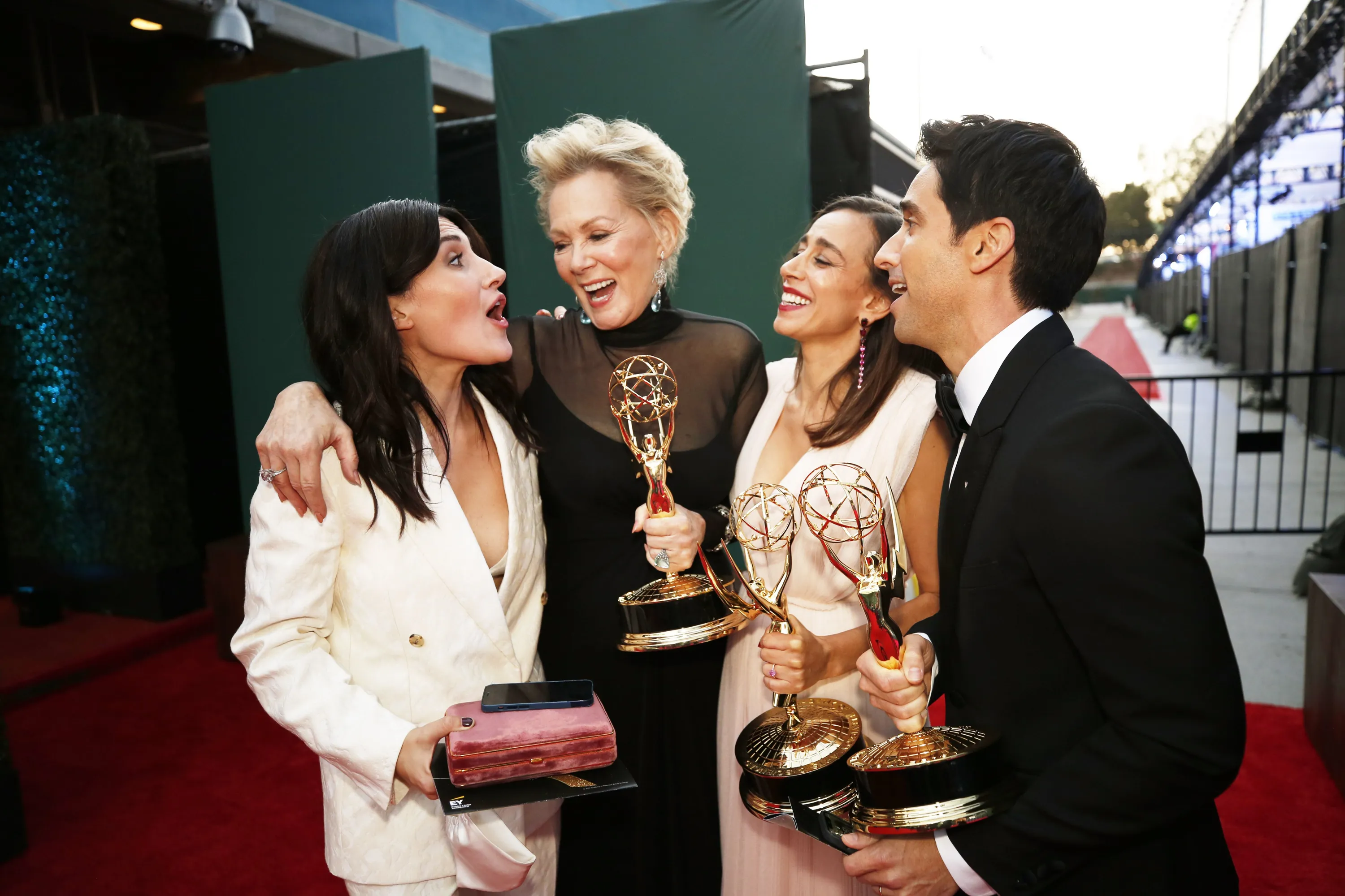 Showrunner Jen Statsky, actor Jean Smart, co-showrunners Lucia Aniello and actor Paul W. Downs with their spoils on the red carpet for the 73rd Annual Emmy Awards in Los Angeles, California on September 19, 2021. (Photo by Al Seib/Los Angeles Times/Rex Features/Shutterstock)