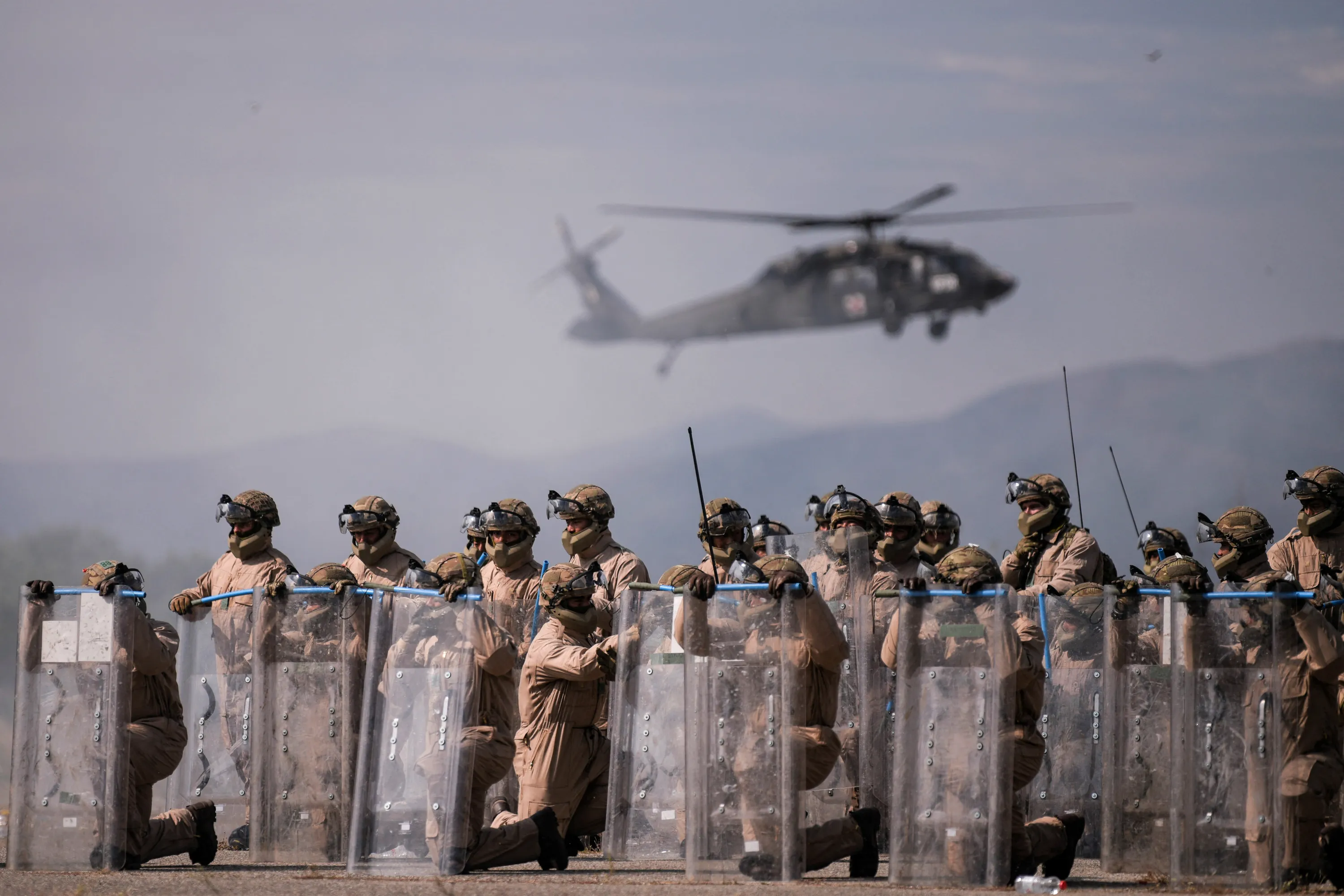 British NATO soldiers serving in the NATO-led peacekeeping force (KFOR) take part in a crowd and riot control exercise near the town of Gjakova on September 5, 2021. The Operational Rehearsal Training Exercise, called “OPREH Level II” is a routine exercise in support to KFOR mission. The training involves hundreds of troops from NATO countries which integrate with KFOR, as part of KFOR's Operational Reserve Force. (Photo by Armend Nimani/AFP Photo)