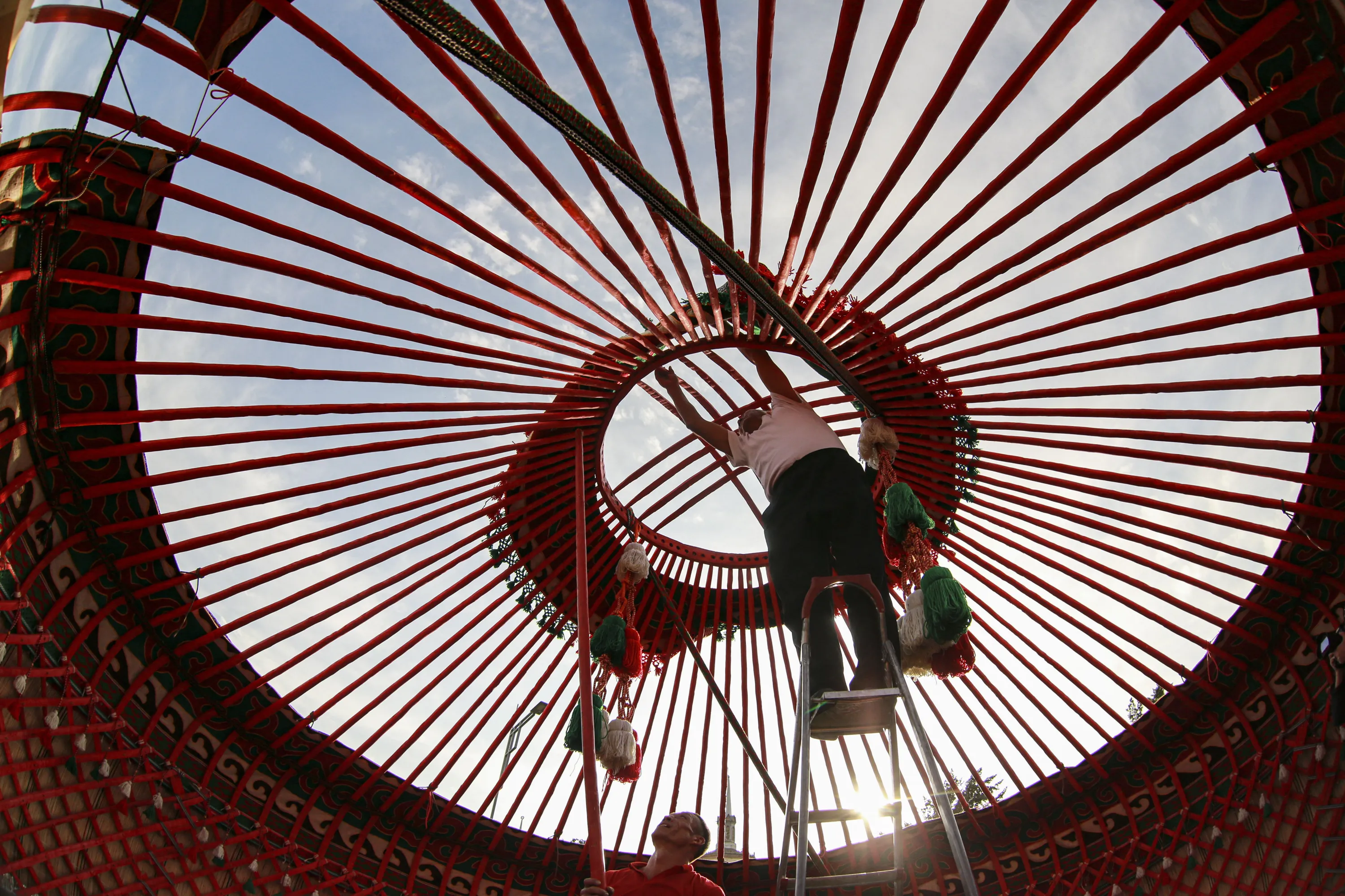 Kyrgyz men assemble a yurt preparing for the World Festival of Epics of the World on the central square of Bishkek, Kyrgyzstan, 22 September 2021. The cultural festival runs from 23 to 26 September. The yurt is traditional round tent used by the nomads in Central Asian steppes, consists of a wooden frame covered with felt or skins. (Photo by Igor Kovalenko/EPA/EFE)
