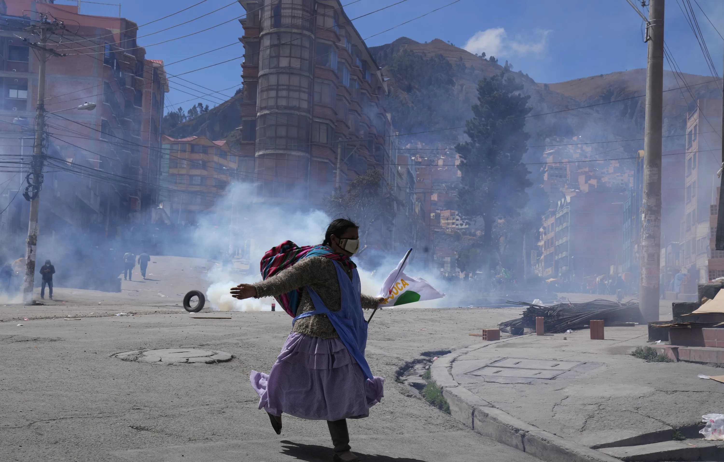 An anti-government coca farmer runs away from tear gas fired by riot police near the coca market in La Paz, Bolivia, Thursday, September 23, 2021. The anti-government coca farmers tried to take over the coca market by force, after losing control when another group of coca growers elected a new leader. (Photo by Juan Karita/AP Photo)