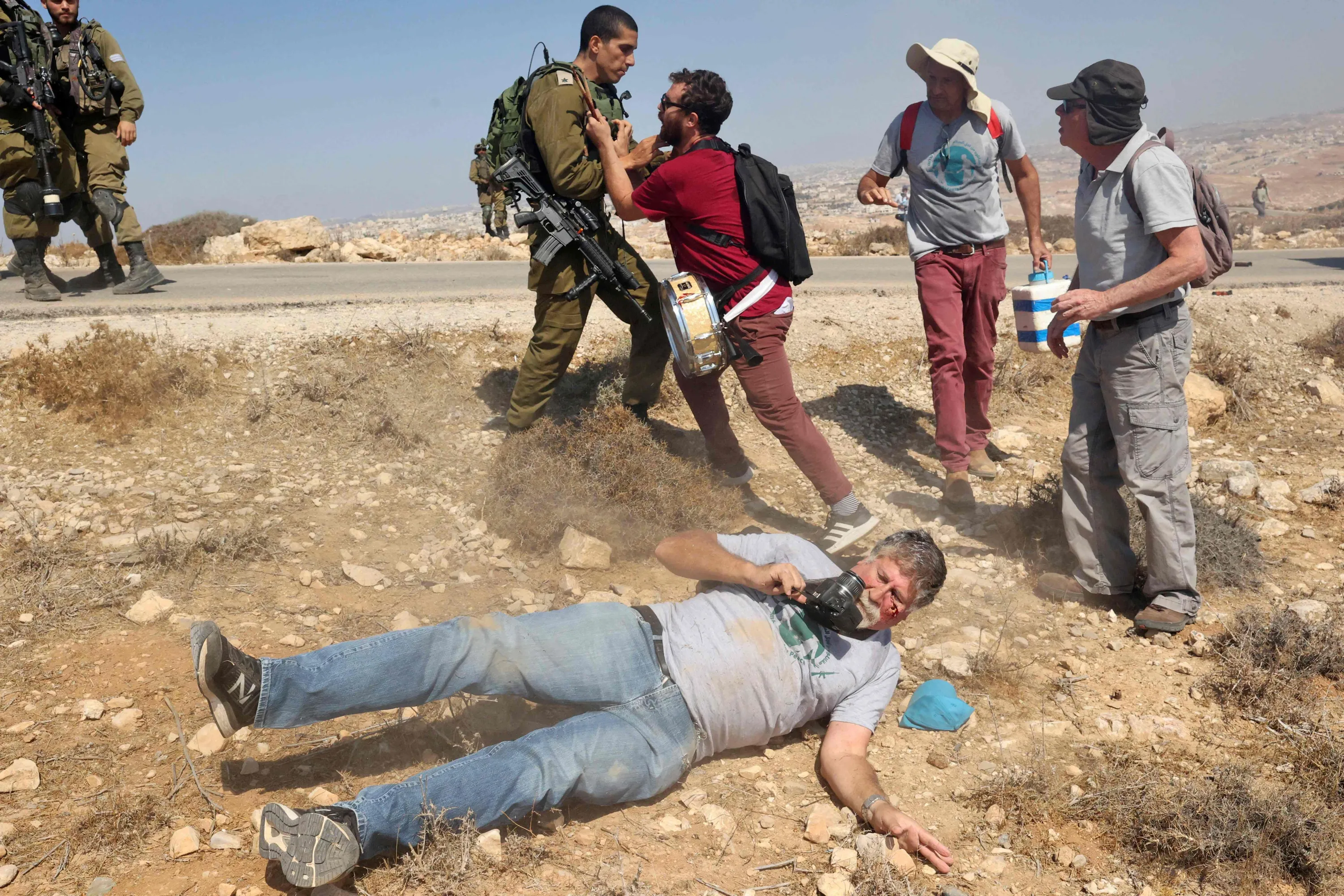 An Israeli activist lies injured on the floor after he was pushed by an Israeli soldier (top) during a demonstration against Israeli land confiscation and the cutting of water supply for Palestinians villages, in the southern area of the West bank town of Hebron, on September 17, 2021. (Photo by Hazem Bader/AFP Photo)
