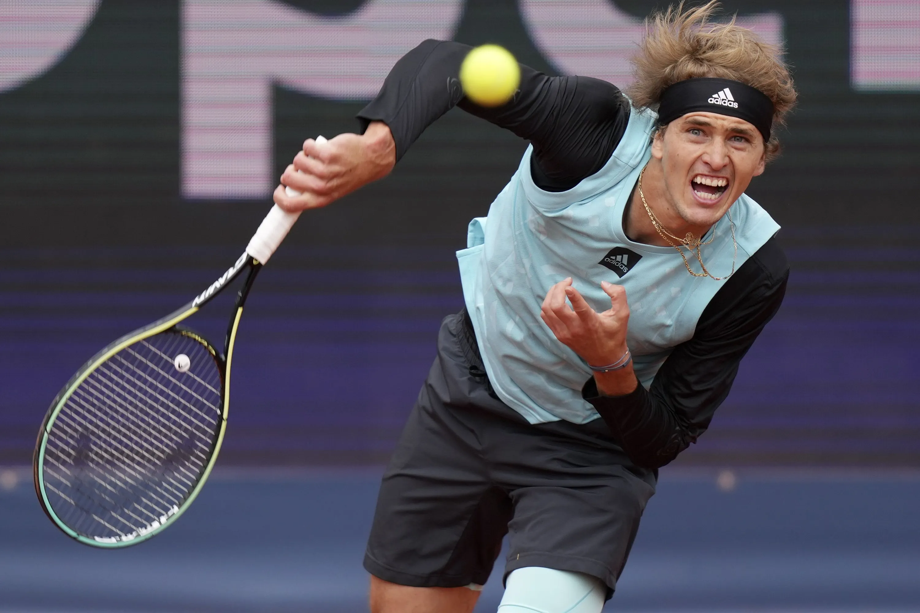 Alexander Zverev of Germany serves the ball during his first round match against Holger Rune of Denmark at the Tennis ATP tournament in Munich, Germany, Wednesday, April 27, 2022. (Photo by Matthias Schrader/AP Photo)