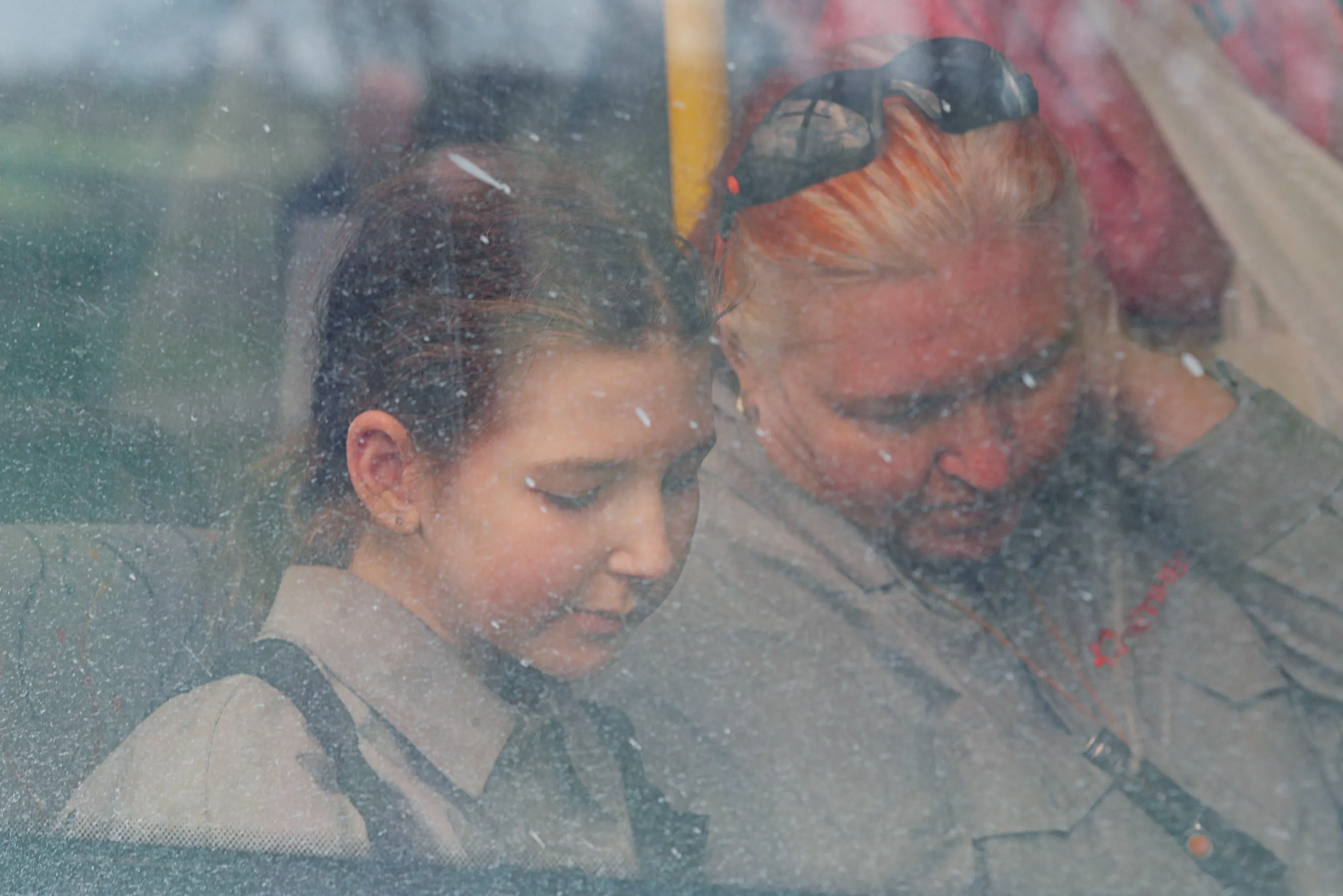 People are seen through a bus window as civilians from Mariupol, including evacuees from Azovstal steel plant, travel in a convoy to Zaporizhzhia, during Ukraine-Russia conflict in the Donetsk Region, Ukraine on May 2, 2022. (Photo by Alexander Ermochenko/Reuters)