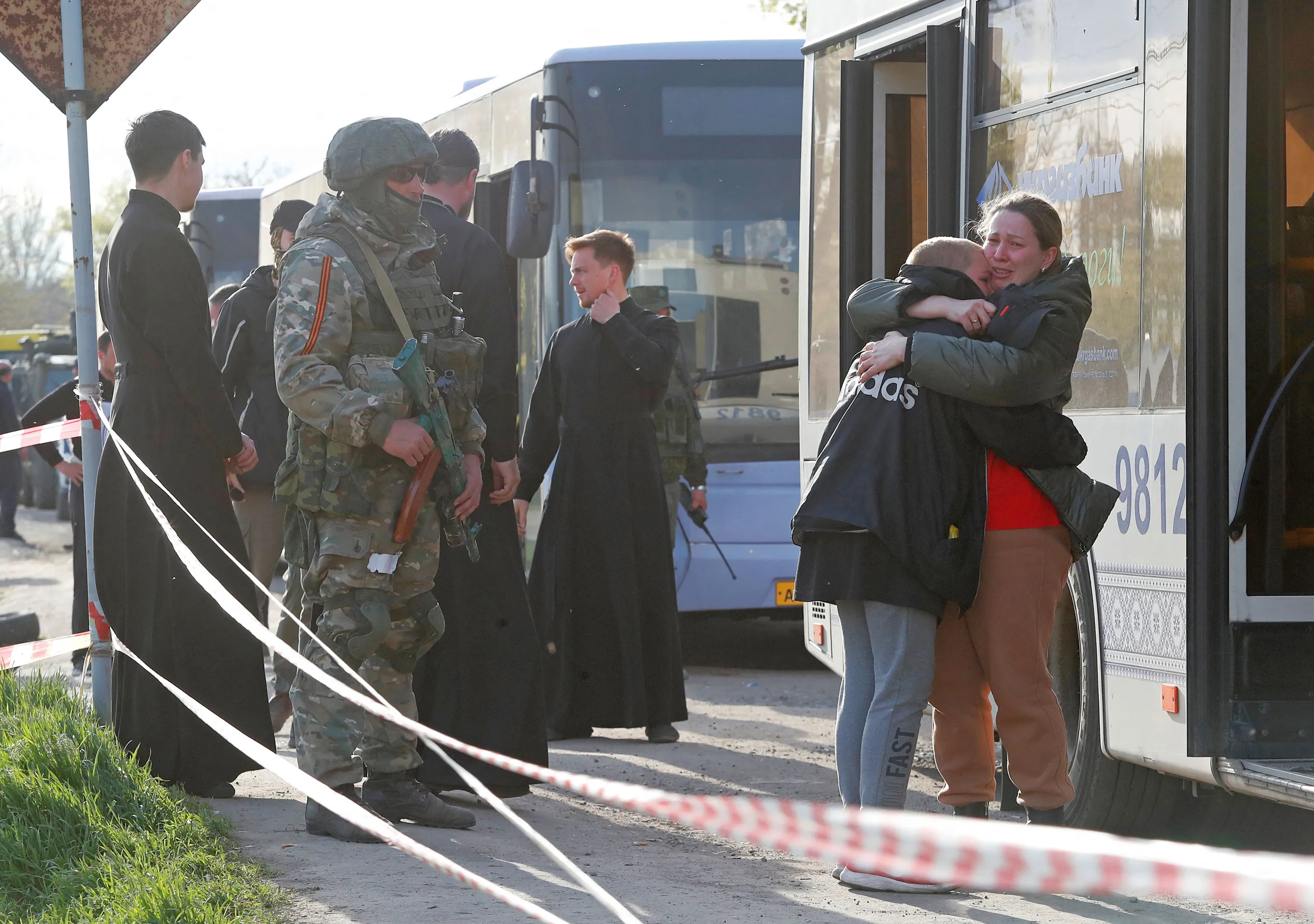 Azovstal steel plant employee Valeria, last name withheld, evacuated from Mariupol, hugs her son Matvey, who had earlier left the city with his relatives, as they meet at a temporary accommodation centre during Ukraine-Russia conflict in the village of Bezimenne in the Donetsk Region, Ukraine on May 1, 2022. (Photo by Alexander Ermochenko/Reuters)