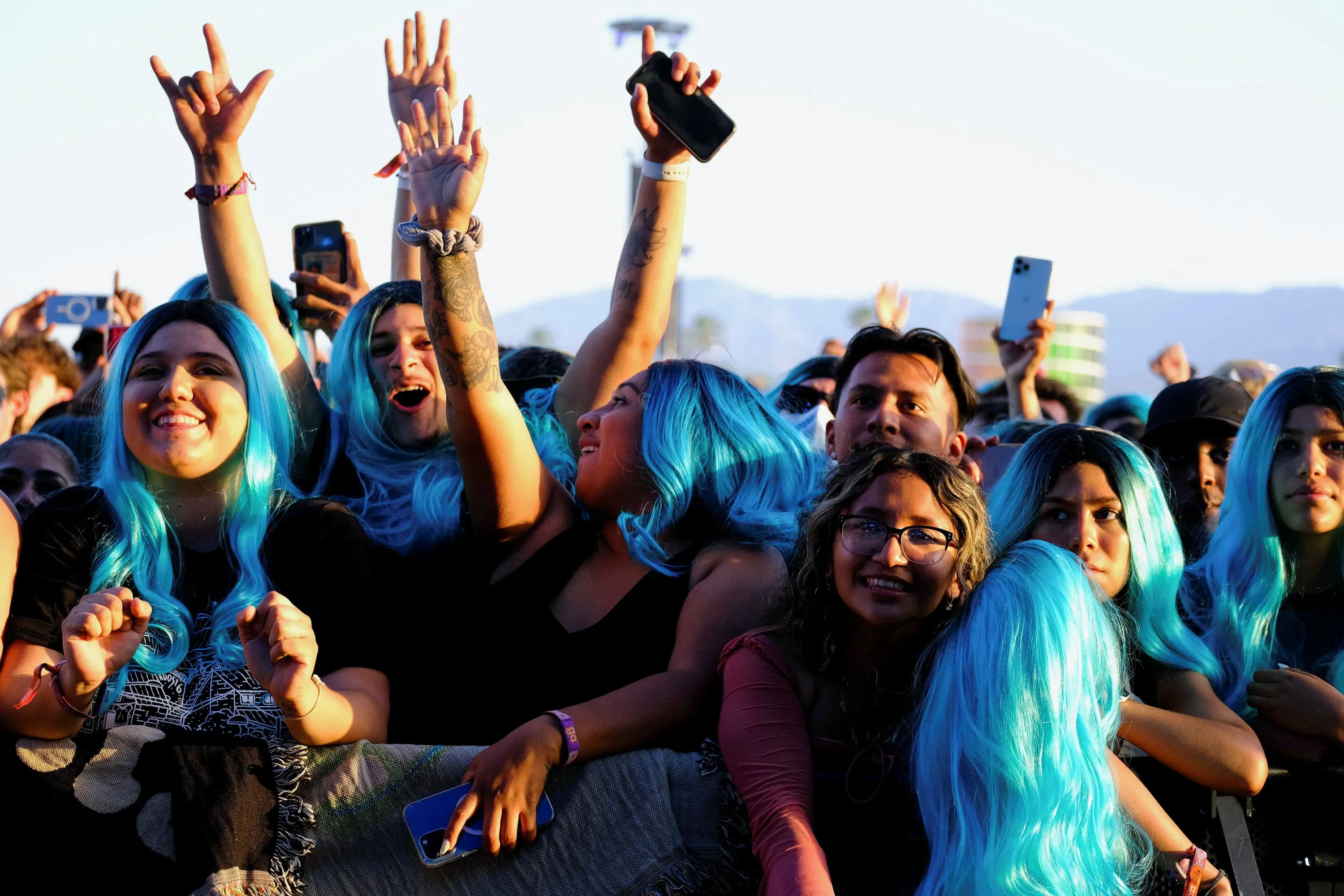 A crowd of blue wigs is seen as Karol G performs at the Coachella Valley Music and Arts Festival held at the Empire Polo Club in Indio, California, U.S., April 24, 2022. (Photo by Maria Alejandra Cardona/Reuters)