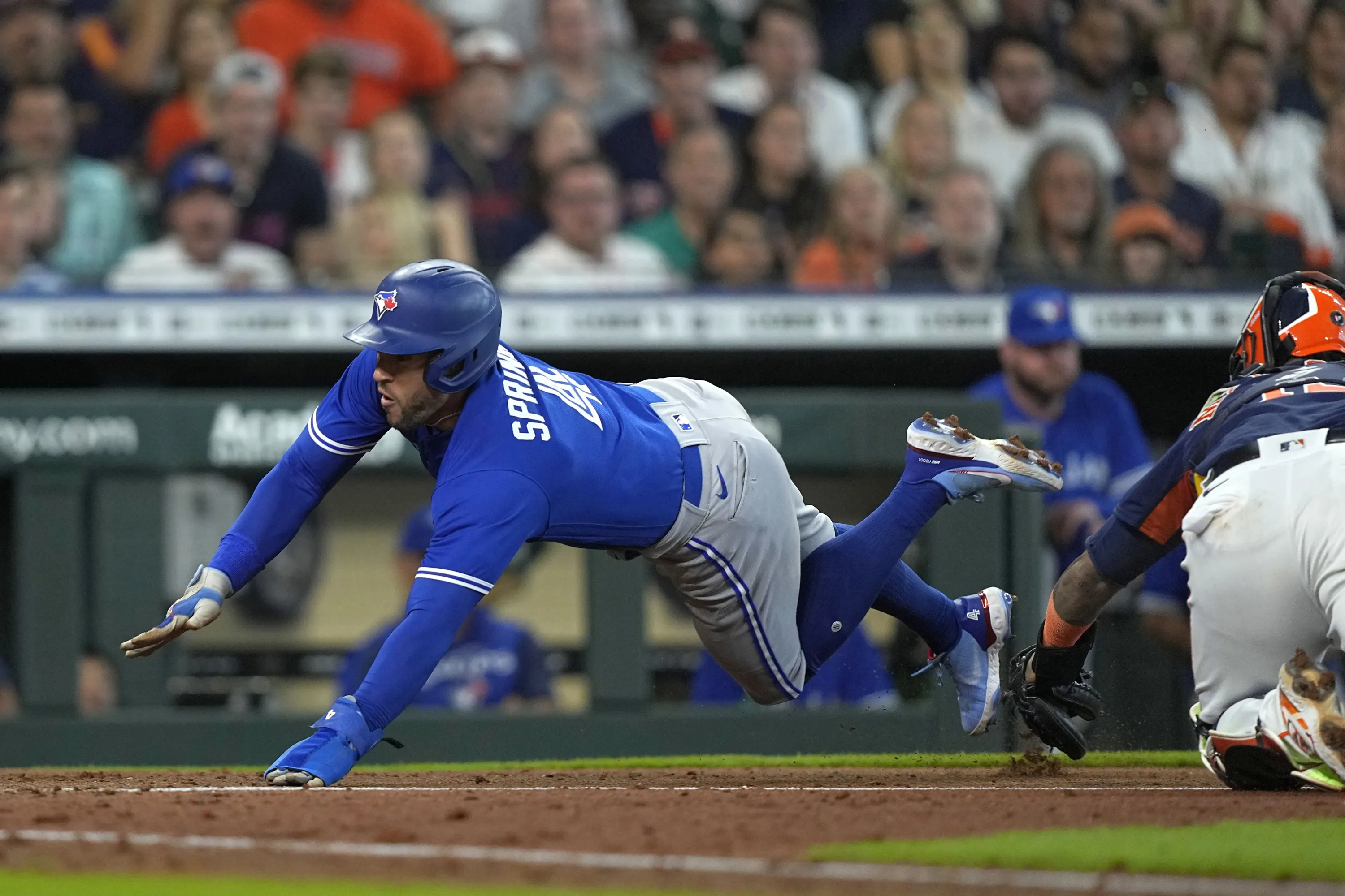 Toronto Blue Jays' George Springer (4) avoids the tag of Houston Astros catcher Martin Maldonado as he scores during the fourth inning of a baseball game Sunday, April 24, 2022, in Houston. (Photo by David J. Phillip/AP Photo)