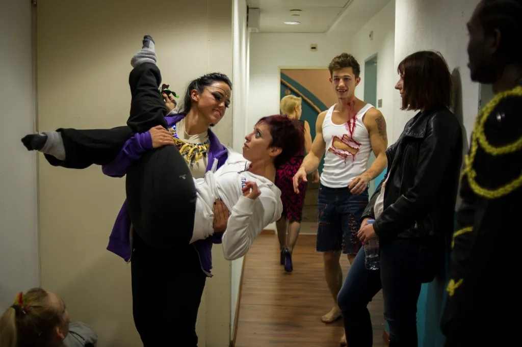 ZURICH, SWITZERLAND - NOVEMBER 10: Competitors joke prior to participating at the World Pole Dancing Championship 2012 held at the Volkshaus on November 10, 2012 in Zurich, Switzerland. The public's perception of pole dancing has recently changed to become a popular sport combining physical strength, technique and choreography. (Photo by Harold Cunningham/Getty Images)