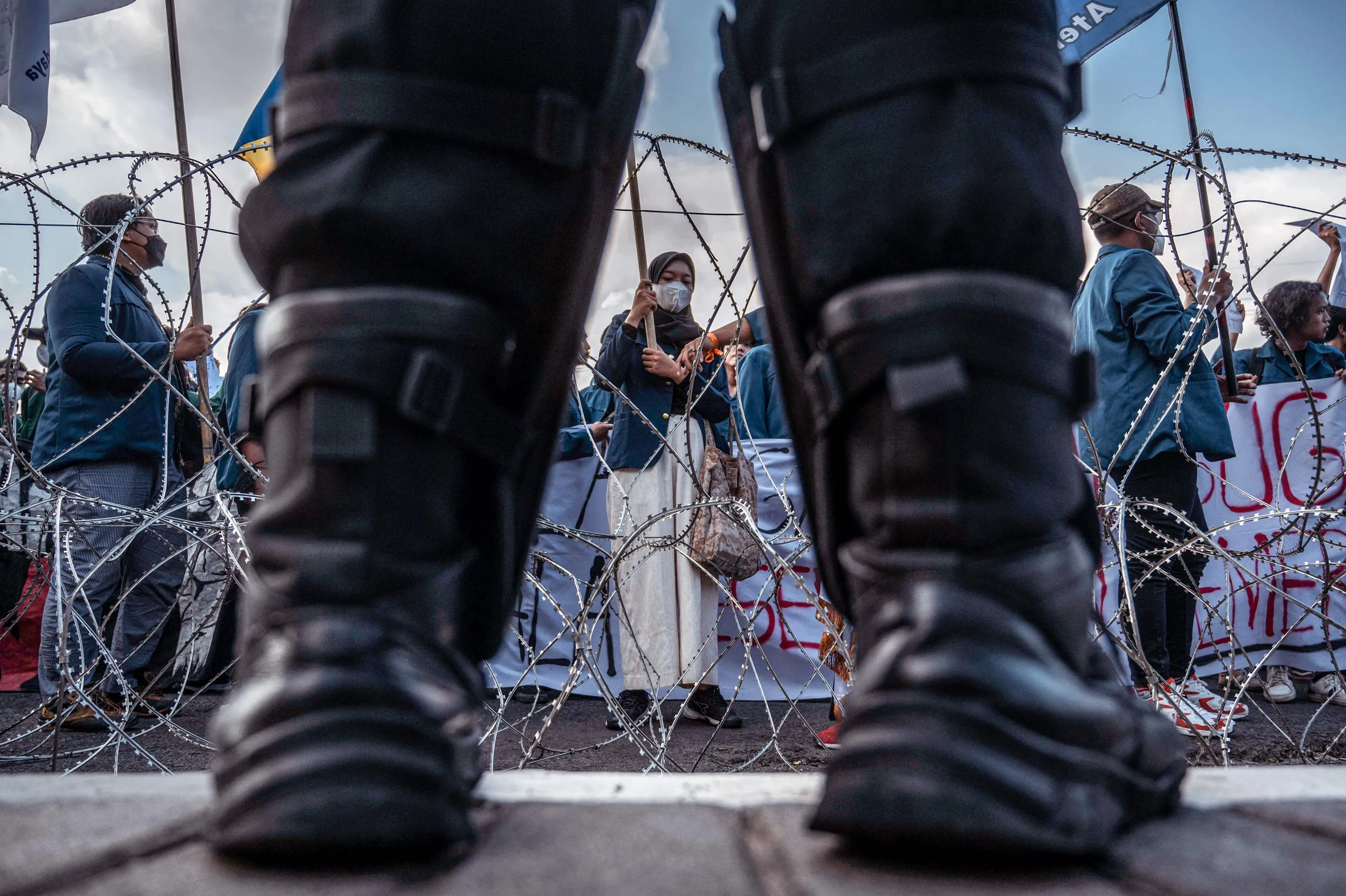 Students protesting against the price hike of basic comodities in front of the regional parliament building, in Surabaya, on April 14, 2022. (Photo by Juni Kriswanto/AFP Photo)