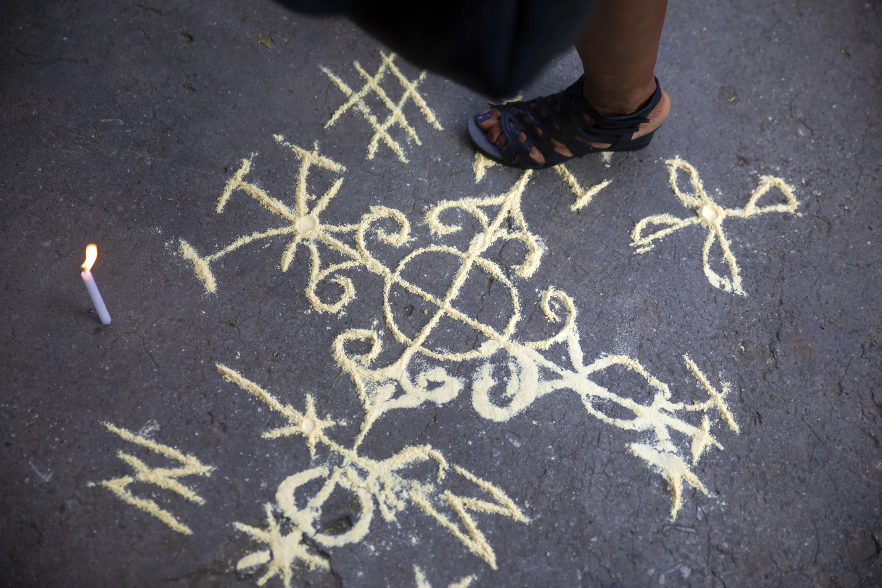 Vodou iconography is seen on the floor during the funeral of Euvonie Georges Auguste, a prominent Vodou priestess and secretary general of Haiti's National Conference of Voodooists, in Port-au-Prince, Saturday, April 9, 2022. Euvonie Georges Auguste was outspoken on political issues, taking part in meetings held by the Organization of American States and participating in the successful campaign to make Vodou an official religion in Haiti in the early 2000s. (Photo by Joseph Odelyn/AP Photo)