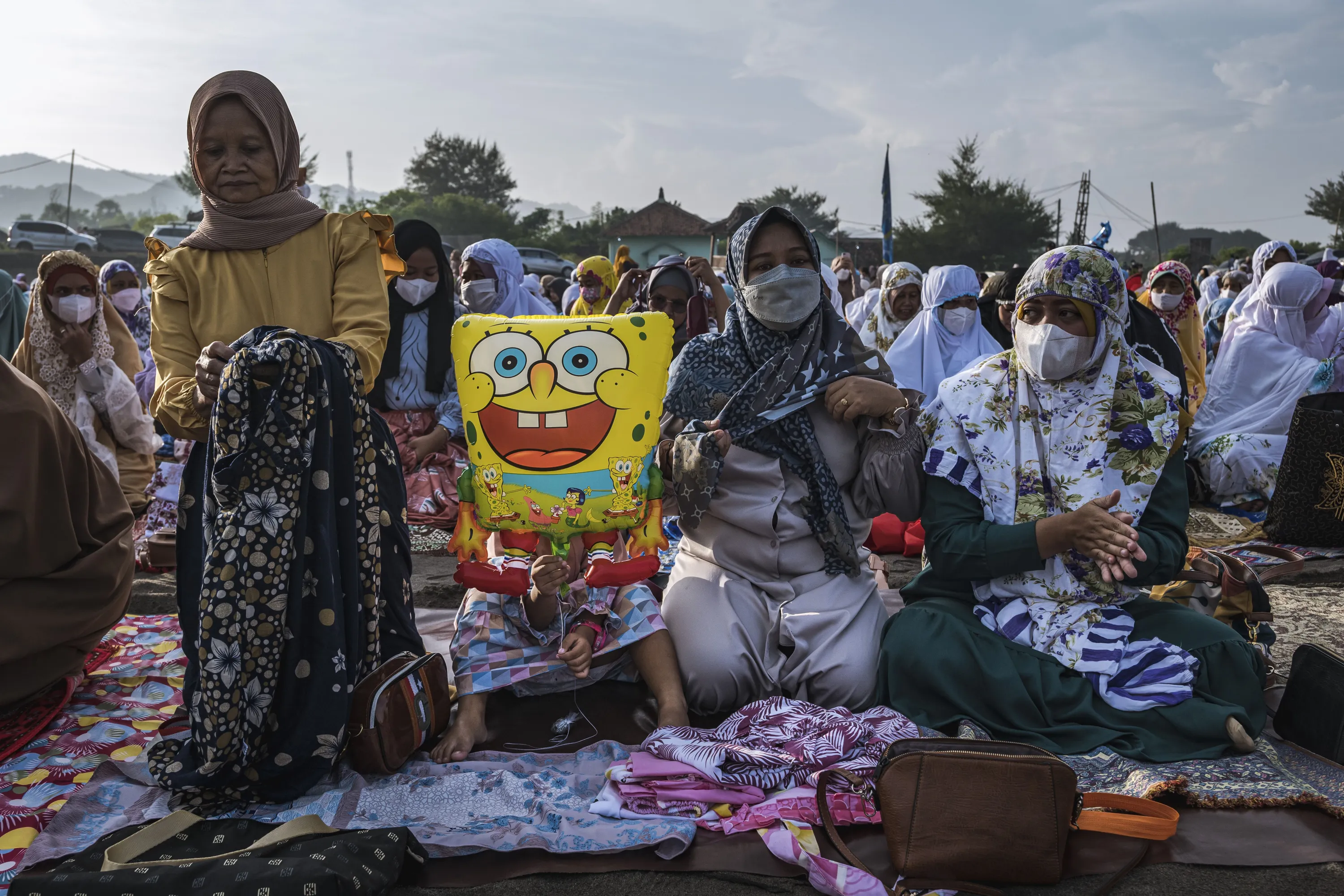 A girl holds a balloon as muslims women attend the Eid Al-Fitr prayer on the 'sea of sands' at Parangkusumo beach on May 02, 2022 in Yogyakarta, Indonesia. Muslims around the world celebrate Eid al-Fitr with their families with feasts to mark the end of Ramadan, the holy month of fasting. (Photo by Ulet Ifansasti/Getty Images)