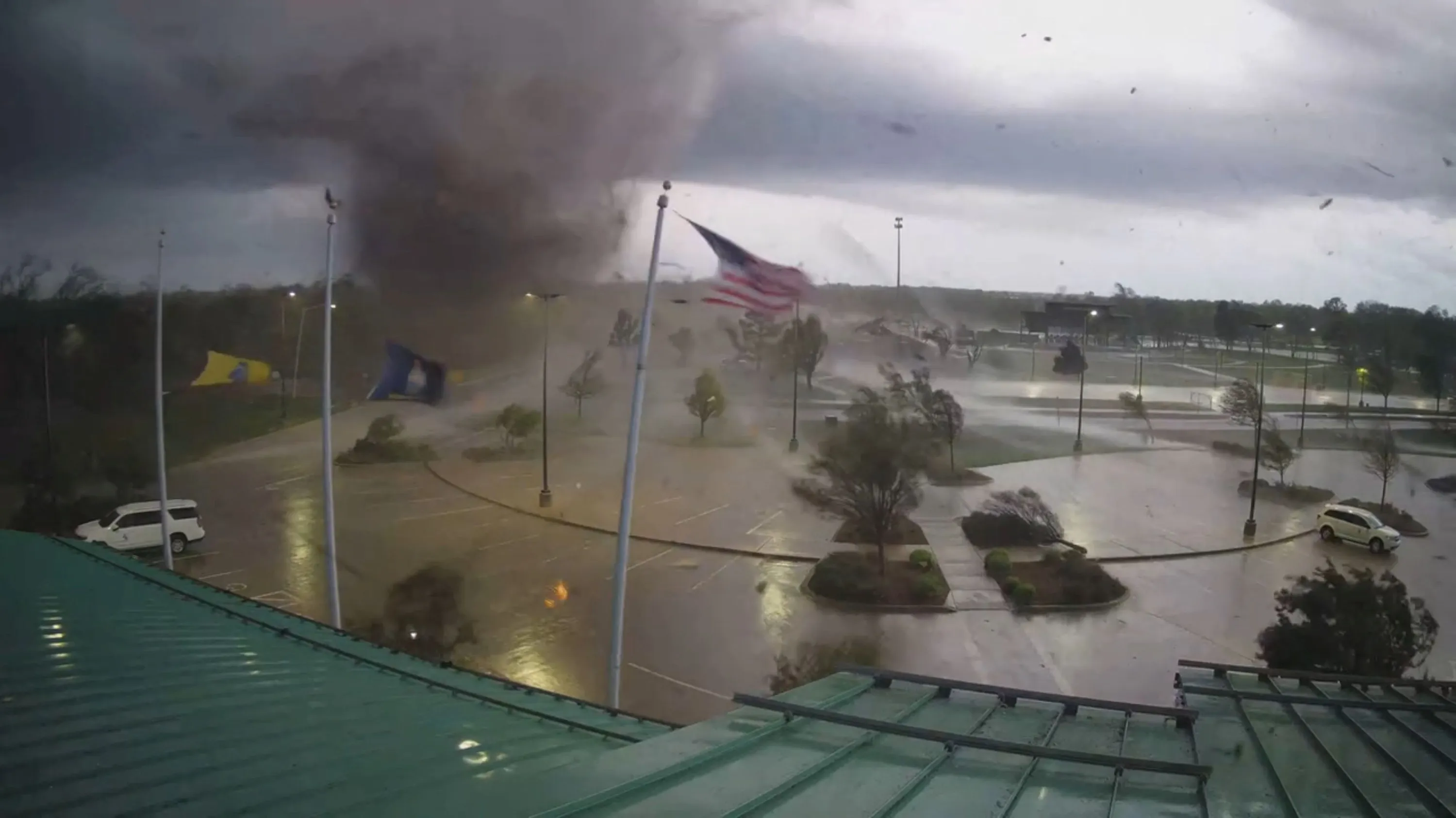 A large tornado is captured on a security camera at the Andover City Hall as it passes through Andover, Kansas, U.S., April 29, 2022 in this still image taken from a handout video. (Photo by City of Andover/Handout via Reuters)