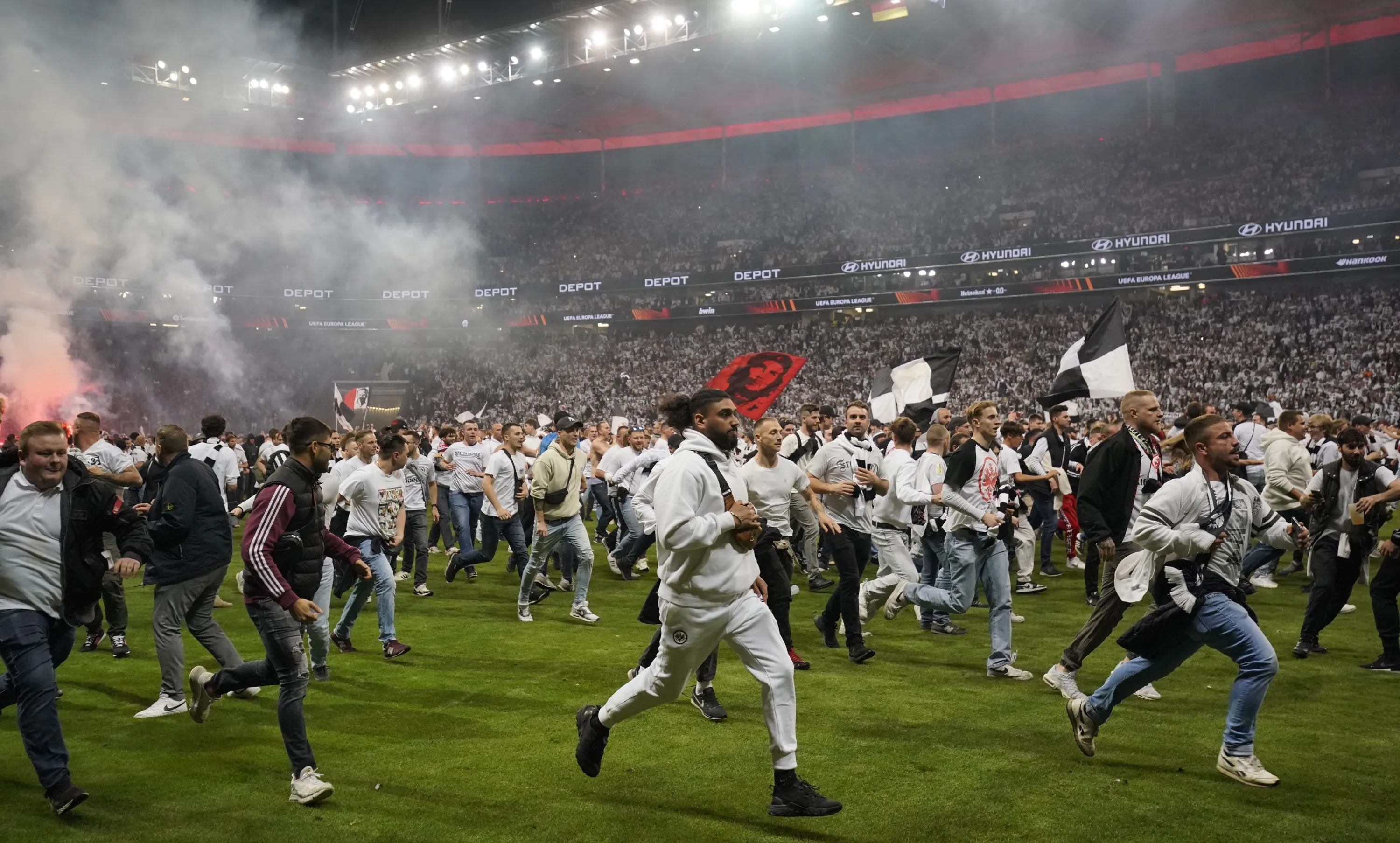 Eintracht Frankfurt fans celebrate on the pitch after the UEFA Europa League semi final, second leg soccer match between Eintracht Frankfurt and West Ham United in Frankfurt am Main, Germany, 05 May 2022. (Photo by Ronald Wittek/EPA/EFE)