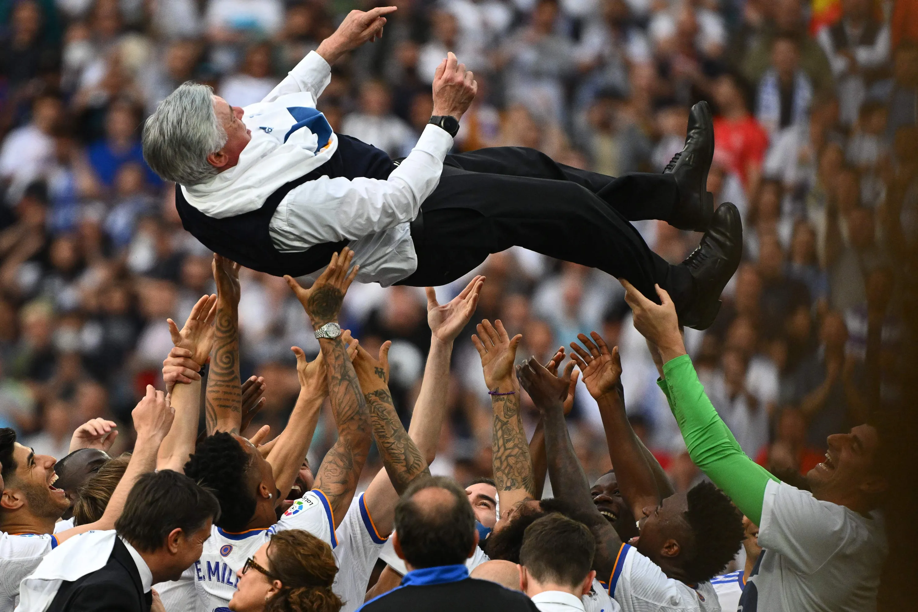 Real Madrid's players carry Real Madrid's Italian coach Carlo Ancelotti at the end of the Spanish League football match between Real Madrid CF and RCD Espanyol at the Santiago Bernabeu stadium in Madrid on April 30, 2022. Real Madrid secured a 35th La Liga title with four games to spare after a 4-0 home win over Espanyol that included two goals from Rodrygo. Needing just one point to clinch the trophy, Madrid struck twice through the Brazilian in the first half at the Santiago Bernabeu before further goals from Marco Asensio and Karim Benzema. (Photo by Gabriel Bouys/AFP Photo)