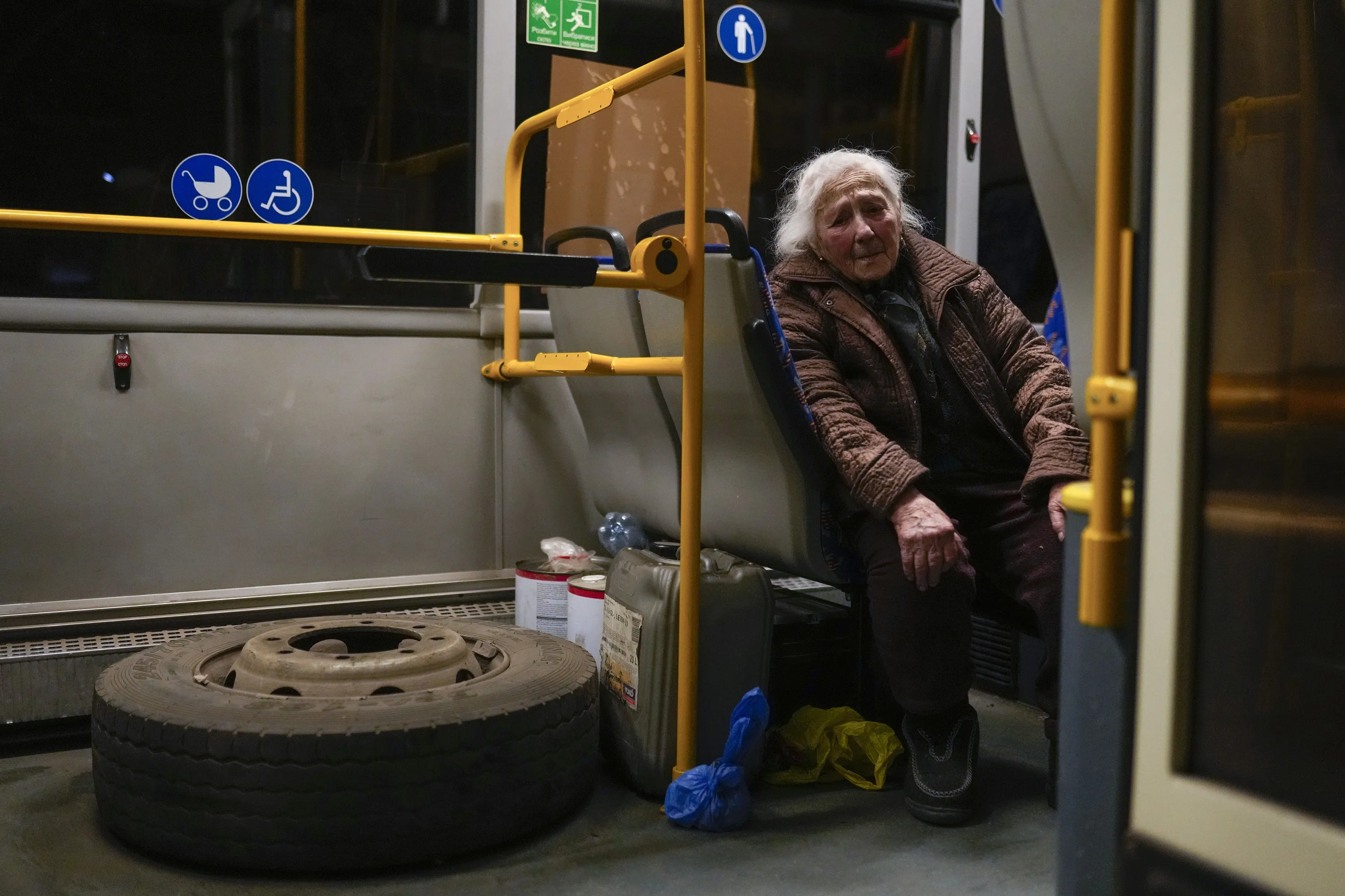 A woman who fled from the Azovstal steel plant in Mariupol waits in a bus to be processed upon her arrival to a reception center for displaced people in Zaporizhzhia, Ukraine, Sunday, May 8, 2022. Thousands of Ukrainians continue to leave Russian occupied areas. (Photo by Francisco Seco/AP Photo)