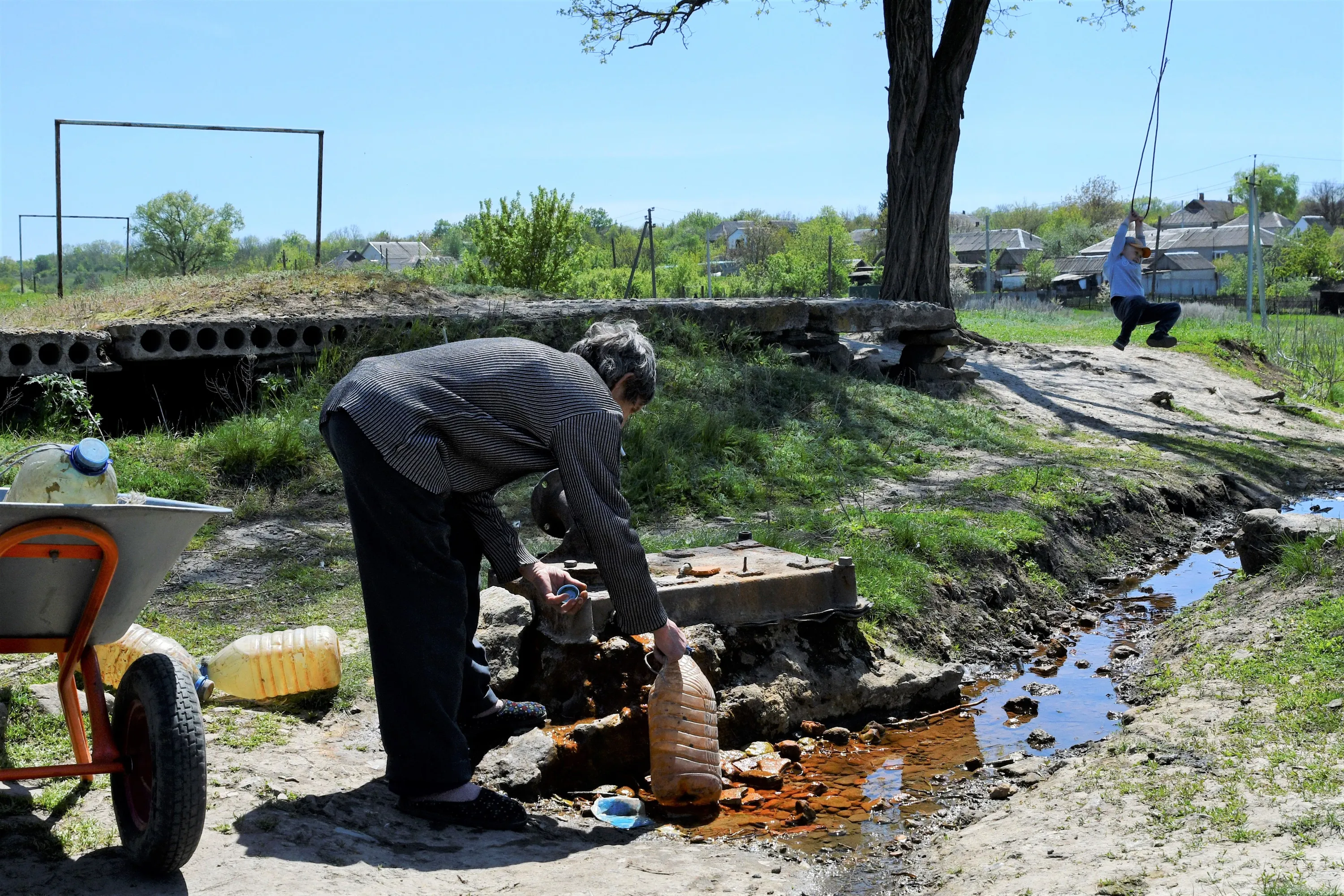 A man fills cans with water as a boy swings on on a rope in Kramatorsk, Ukraine, Saturday, May 7, 2022. (Photo by Andriy Andriyenko/AP Photo)
