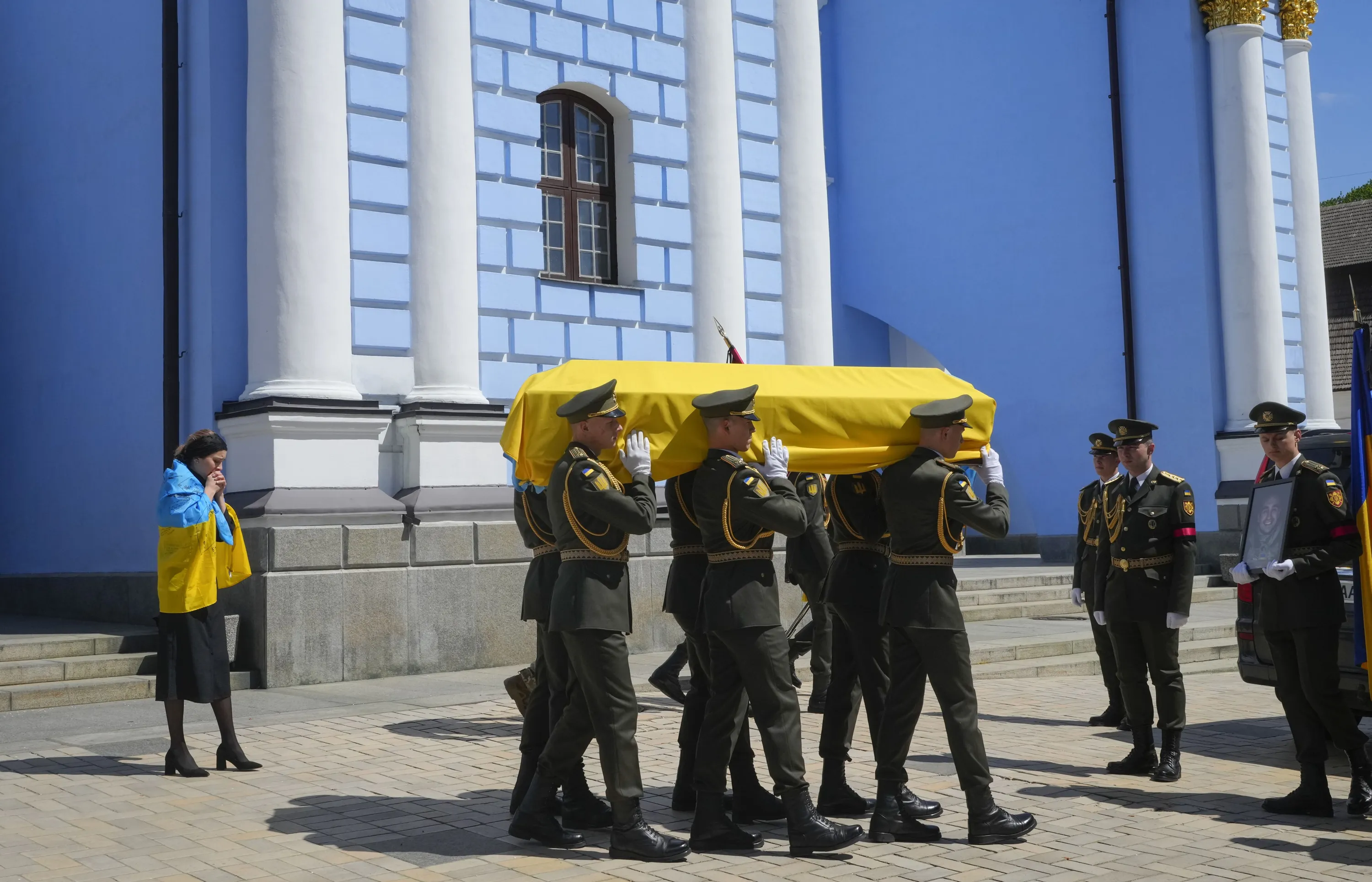 Soldiers carry a coffin with remains of a volunteer soldier Oleksandr Makhov, a well-known Ukrainian journalist, killed by the Russian troops, at St Michael cathedral in Kyiv, Ukraine, Monday, May 9, 2022. The coffin is followed by Makhov's widow. (Photo by Efrem Lukatsky/AP Photo)