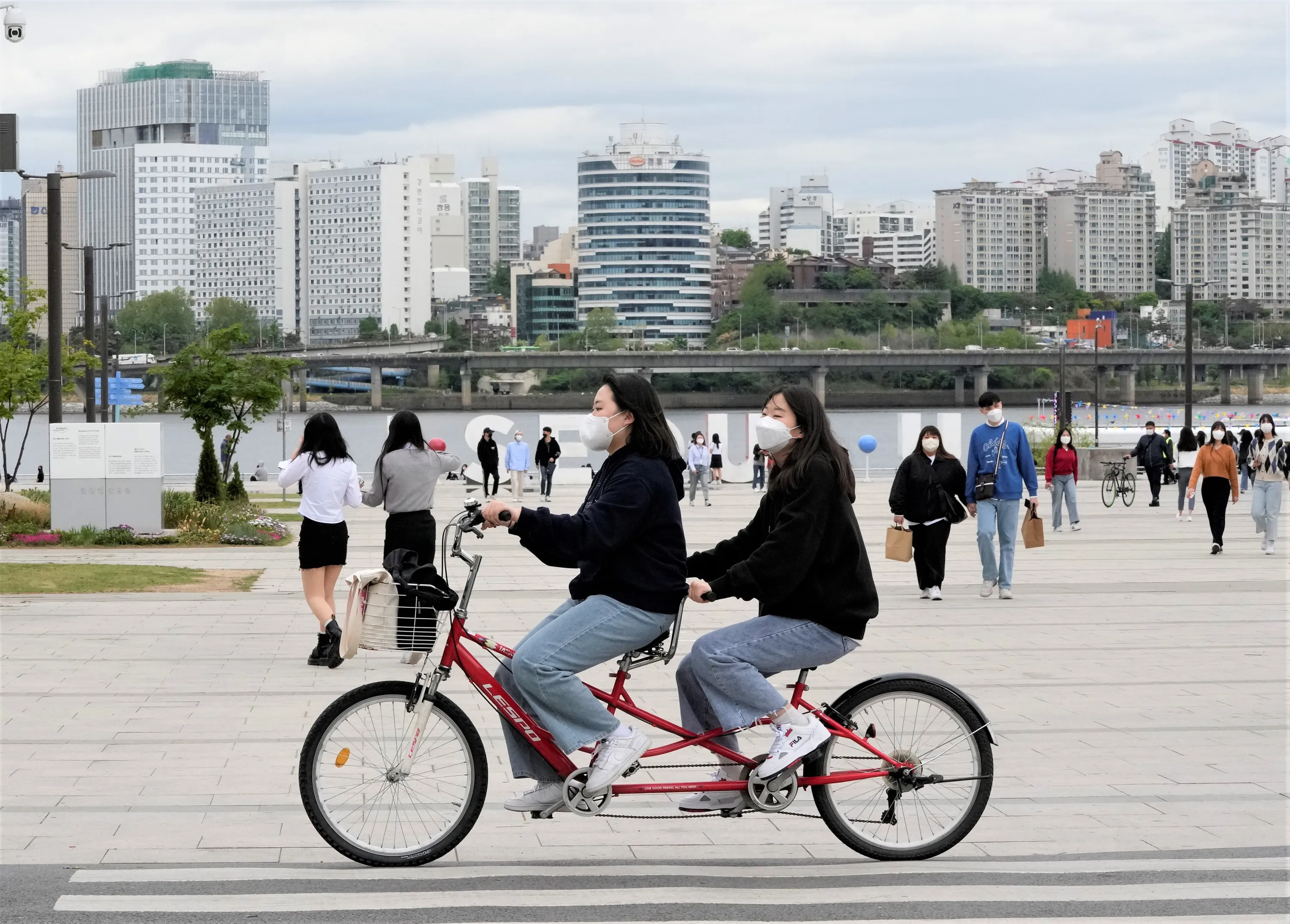 Women wearing face masks ride a bicycle at a park in Seoul, South Korea, Friday, April 29, 2022. South Korea will ease its outdoor mask mandate starting next week as COVID-19 infections and hospitalizations continue to decline. (Photo by Ahn Young-joon/AP Photo)