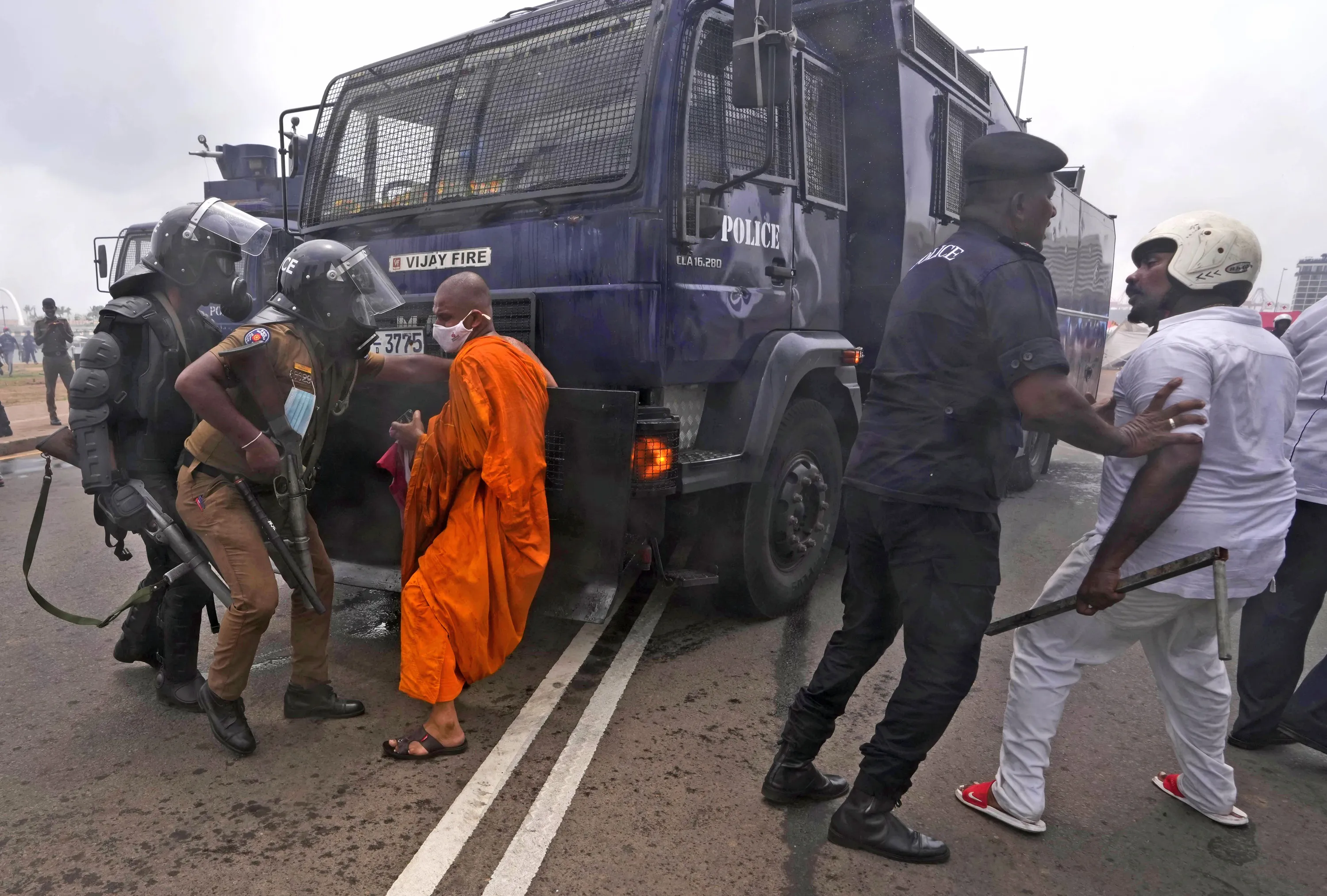 Supporters of Sri Lankan government attempt to block a police water canon truck during a clash with anti government protesters in Colombo, Sri Lanka, Monday, May 9, 2022. Government supporters on Monday attacked protesters who have been camped outside the office of Sri Lanka's prime minster, as trade unions began a “Week of Protests” demanding the government change and its president to step down over the country's worst economic crisis in memory. (Photo by Eranga Jayawardena/AP Photo)