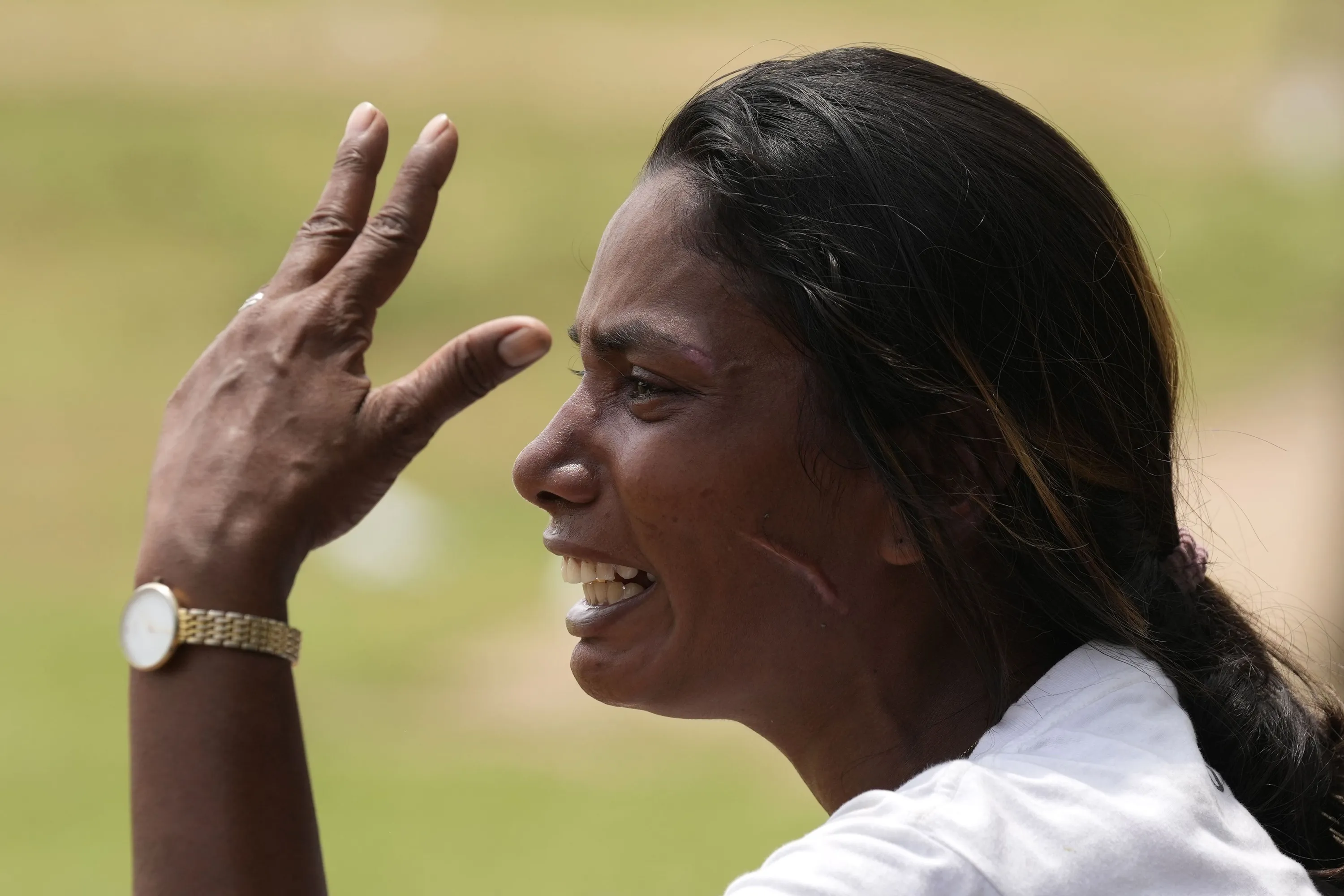 A Sri Lankan woman cries after anti-government protesters were attacked by government supporters outside president's office in Colombo, Sri Lanka, Monday, May 9, 2022. (Photo by Eranga Jayawardena/AP Photo)