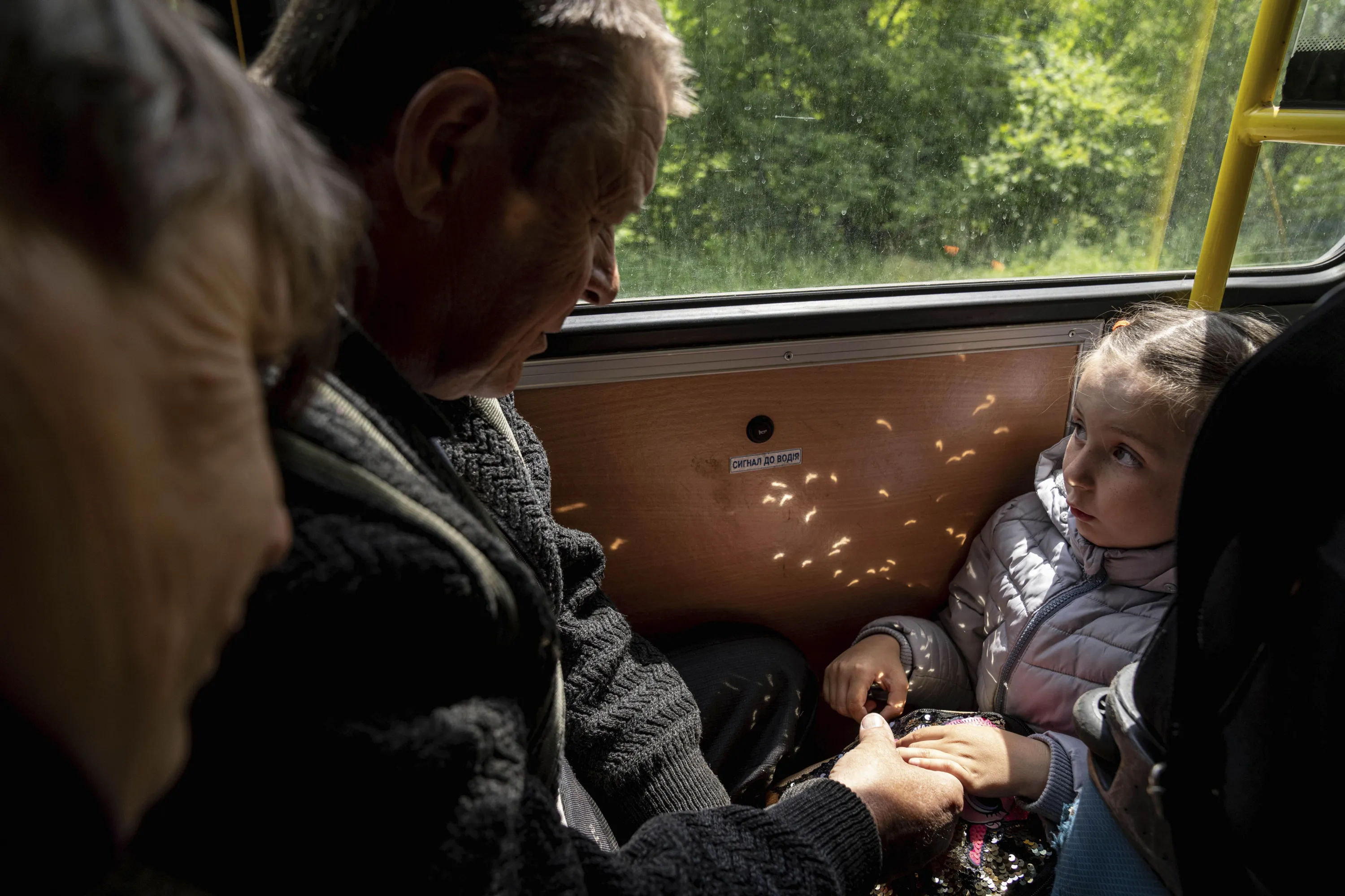 A girl with her grandparents from Lyman ride in the bus during evacuation near Lyman, Ukraine, Wednesday, May 11, 2022. (Photo by Evgeniy Maloletka/AP Photo)