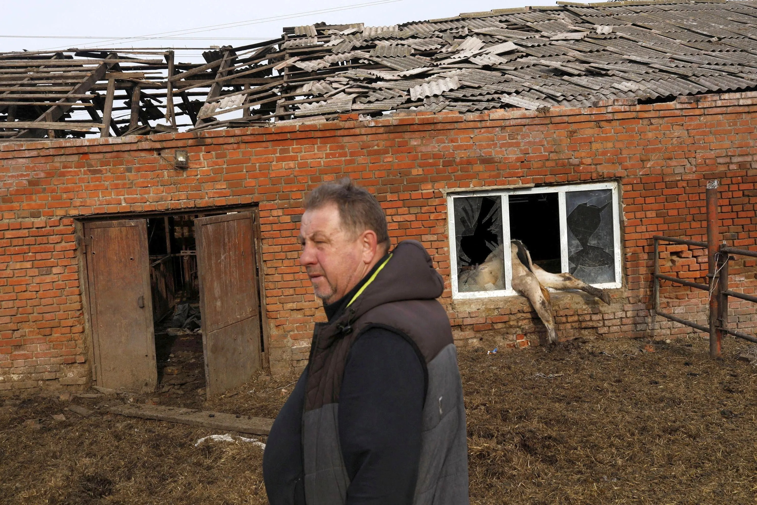 Farmer Oleksandr Novikov, 58, stands next to a dead cow in the window of a damaged barn in Vilhivka village, amid Russia's attack on Ukraine, near Kharkiv, Ukraine, May 11, 2022. (Photo by Ricardo Moraes/Reuters)