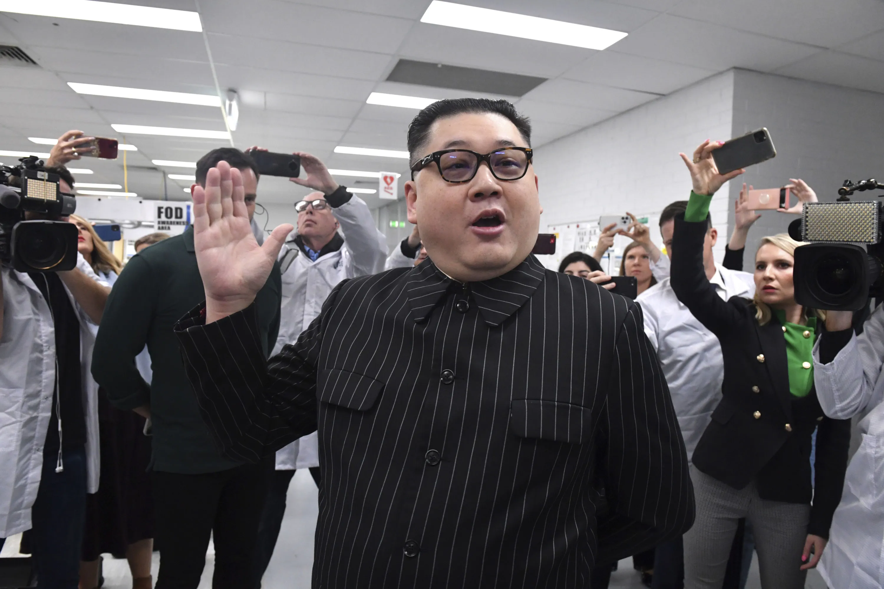 A man impersonating North Korea's leader Kim Jong-un arrives as Prime Minister Scott Morrison leaves Extel Technologies manufacturing facility on Day 33 of the 2022 federal election campaign, in Melbourne, Australia, Friday, May 13, 2022. (Photo by Mick Tsikas/AAP Image via AP Photo)