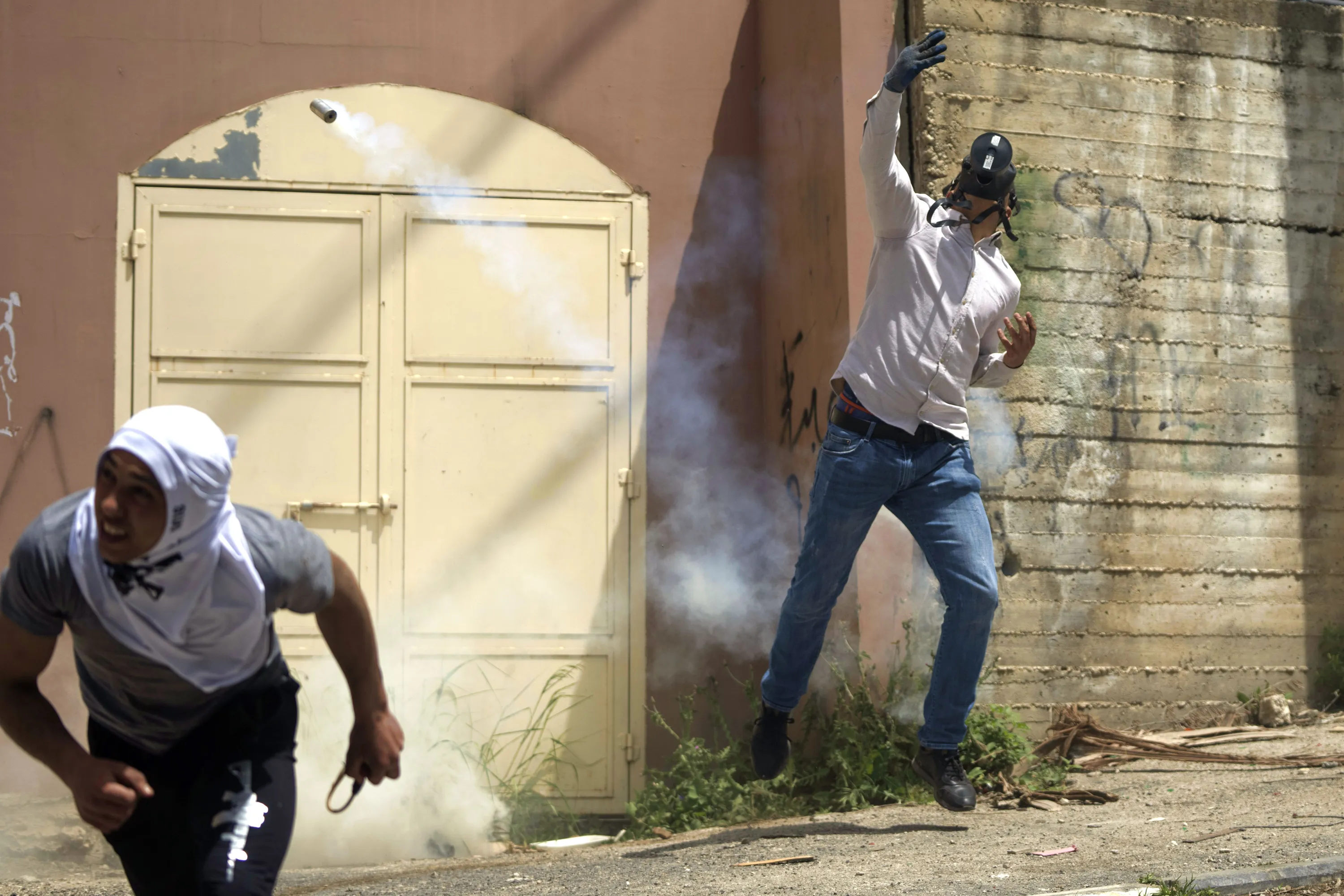 A Palestinian protester returns a teargas canister during clashes with Israeli border police in the West Bank village of Burqa, north of Nablus, Tuesday, April 19, 2022. Palestinians protesting against a settlers march toward Homesh, a settlement that was officially dismantled by Israel in 2005, clashed with Israeli border police that closed the main entrance of the village to secure the event. (Photo by Nasser Nasser/AP Photo)