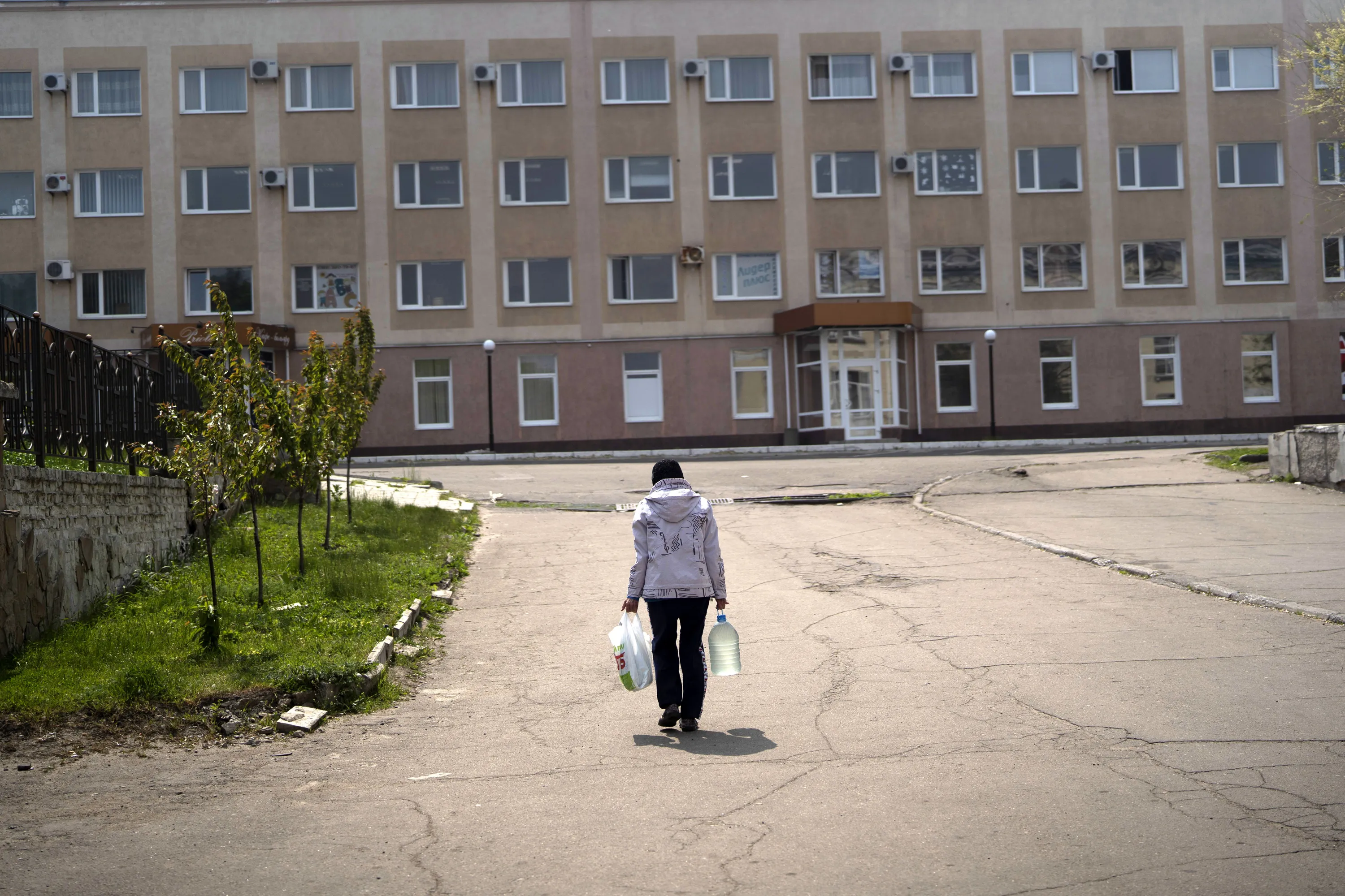An elderly woman carries a can with water after collecting it from a firefighters truck in Lysychansk, Luhansk region, Ukraine, Friday, May 13, 2022. (Photo by Leo Correa/AP Photo)