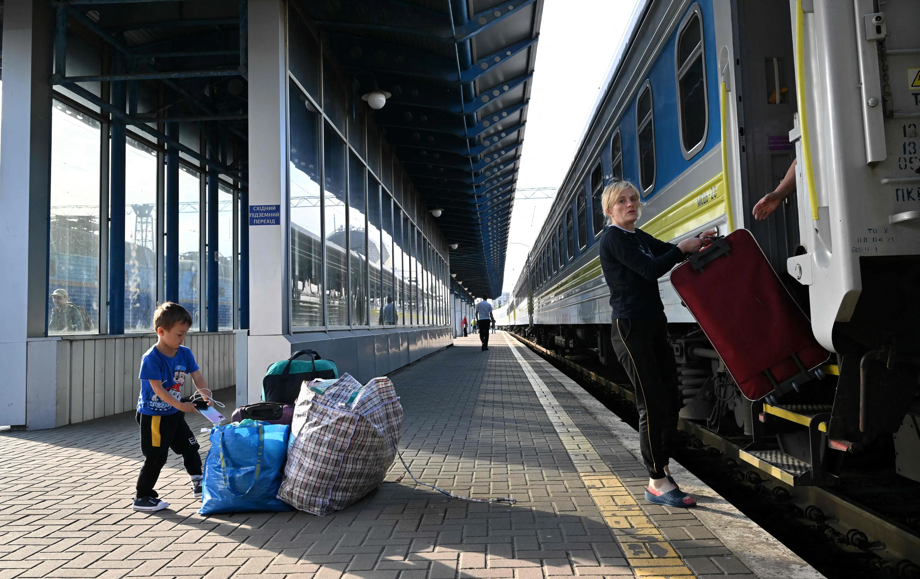 A woman and her child, one of the thousands of women and children who fled the Ukraine after Russia invaded, disembarks with her luggage upon their arrival from Poland, at Kyiv's railway station on May 12, 2022. For the first time since the start of the war, the flow was reversed on May 10 with 29,000 departures for 34,000 returns according to official figures from border guards, even if the balance remains largely negative overall with 5.9 million departures for 1.56 million back. Russia invaded Ukraine on February 24, 2022. (Photo by Sergei Supinsky/AFP Photo)