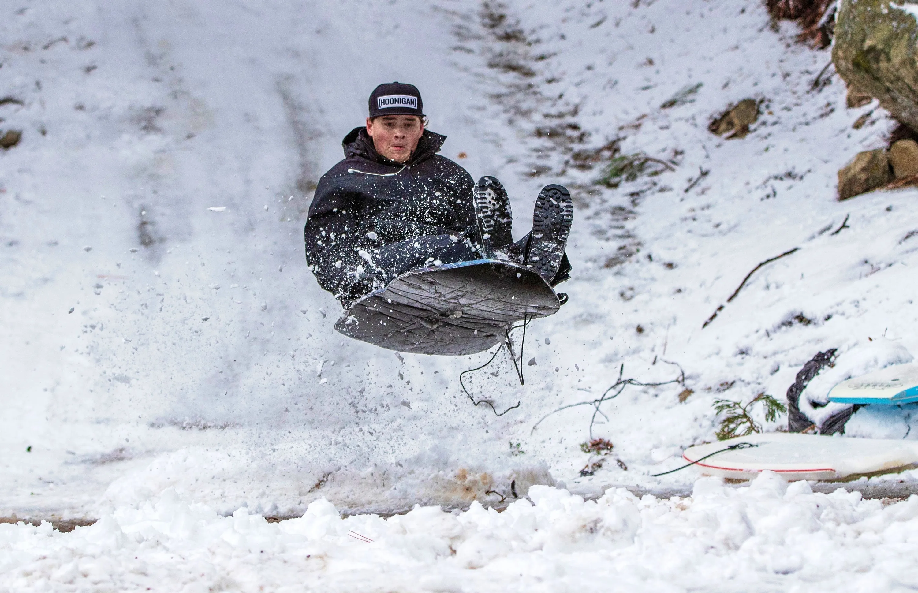 Matthew Eastman, 15, of Forest Falls sleds off a jump he built at the end of his driveway after Monday's winter stormed blanketed the San Bernardino Mountains on December 28, 2021 in Forest Falls, California. (Photo by Gina Ferazzi/Los Angeles Times/Rex Features/Shutterstock)