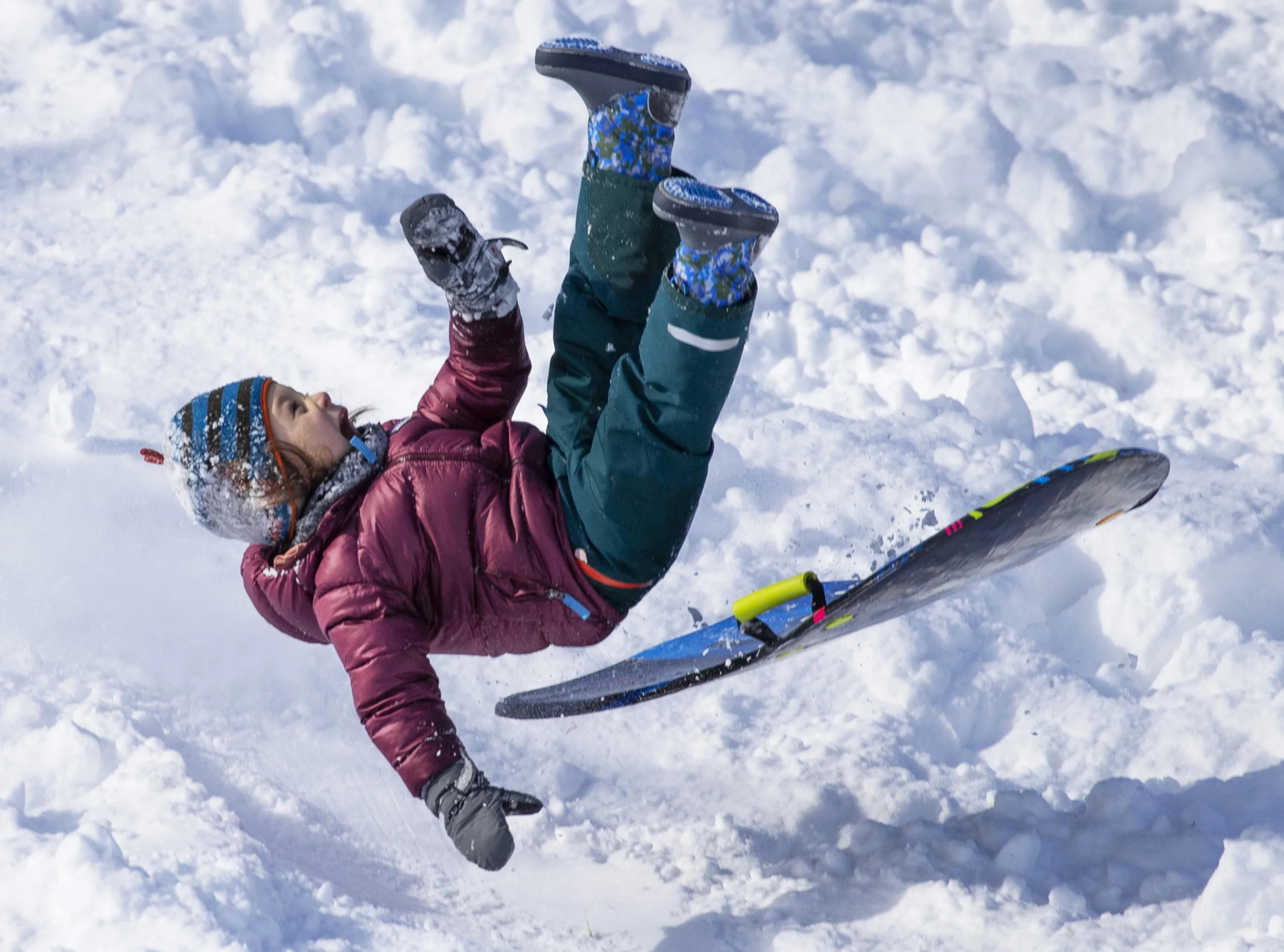 A girl is sent airborne while sledding down a snow covered hill in the South Boston neighborhood of Boston, Massachusetts, USA, 30 January 2022. Boston's Logan Airport recorded 23.5 inches (59.7 cm) with some area towns recording more than two feet (61cm). (Photo by C.J. Gunther/EPA/EFE)