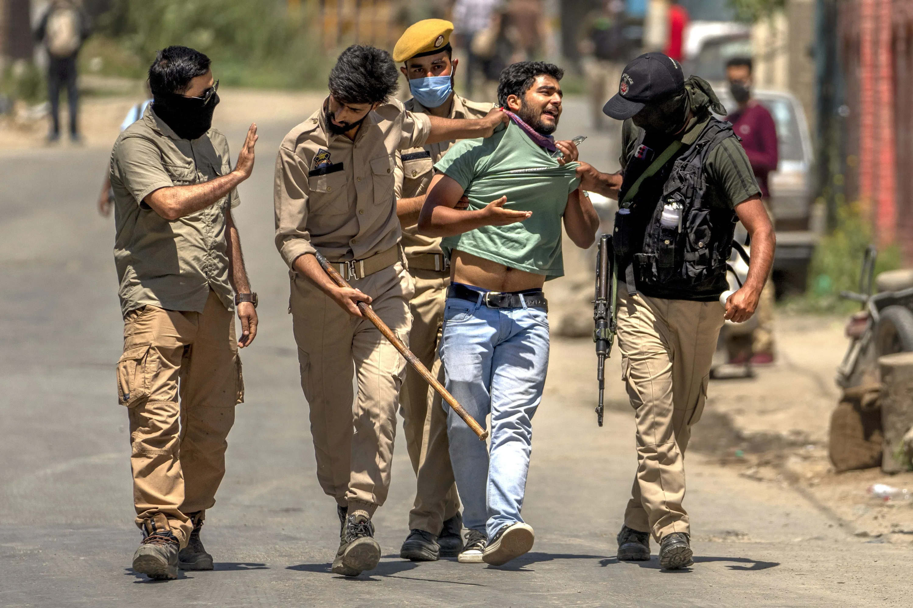 Policemen detain a minority Hindus, locally known as Pandits, during a protest march against the killing of Rahul Bhat, also a Pandit, on the outskirts of Srinagar, Indian controlled Kashmir, Friday, May 13, 2022. Hindus in Indian-controlled Kashmir staged protests on Friday a day after assailants shot and killed the government employee from the minority community. It was the first time that Pandits, an estimated 200,000 of whom fled Kashmir after an anti-India rebellion erupted in 1989, simultaneously organized street protests at several places in the Muslim-majority region. (Photo by Dar Yasin/AP Photo)