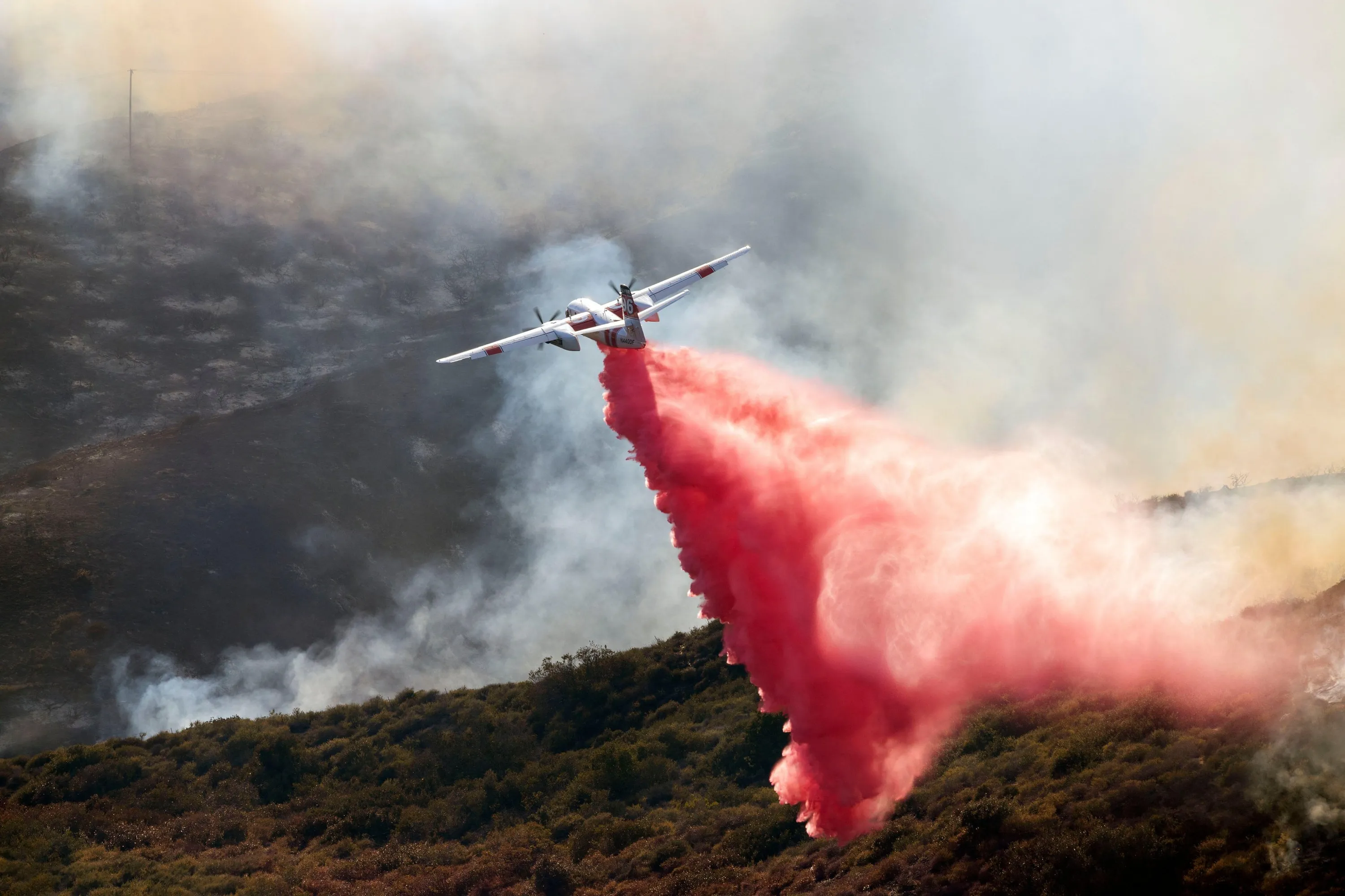 A fire plane drops red fire retardant the Coastal wildfire in Laguna Niguel, California on May 11, 2022. A wind-driven wildfire that broke out Wednesday in brush near Laguna Niguel grew to 200 acres, burned about 20 homes and prompted the evacuation of nearby residences and a luxury resort, fire officials said. (Photo by Ruaridh Stewart/ZUMA Press Wire/Alamy Live News)