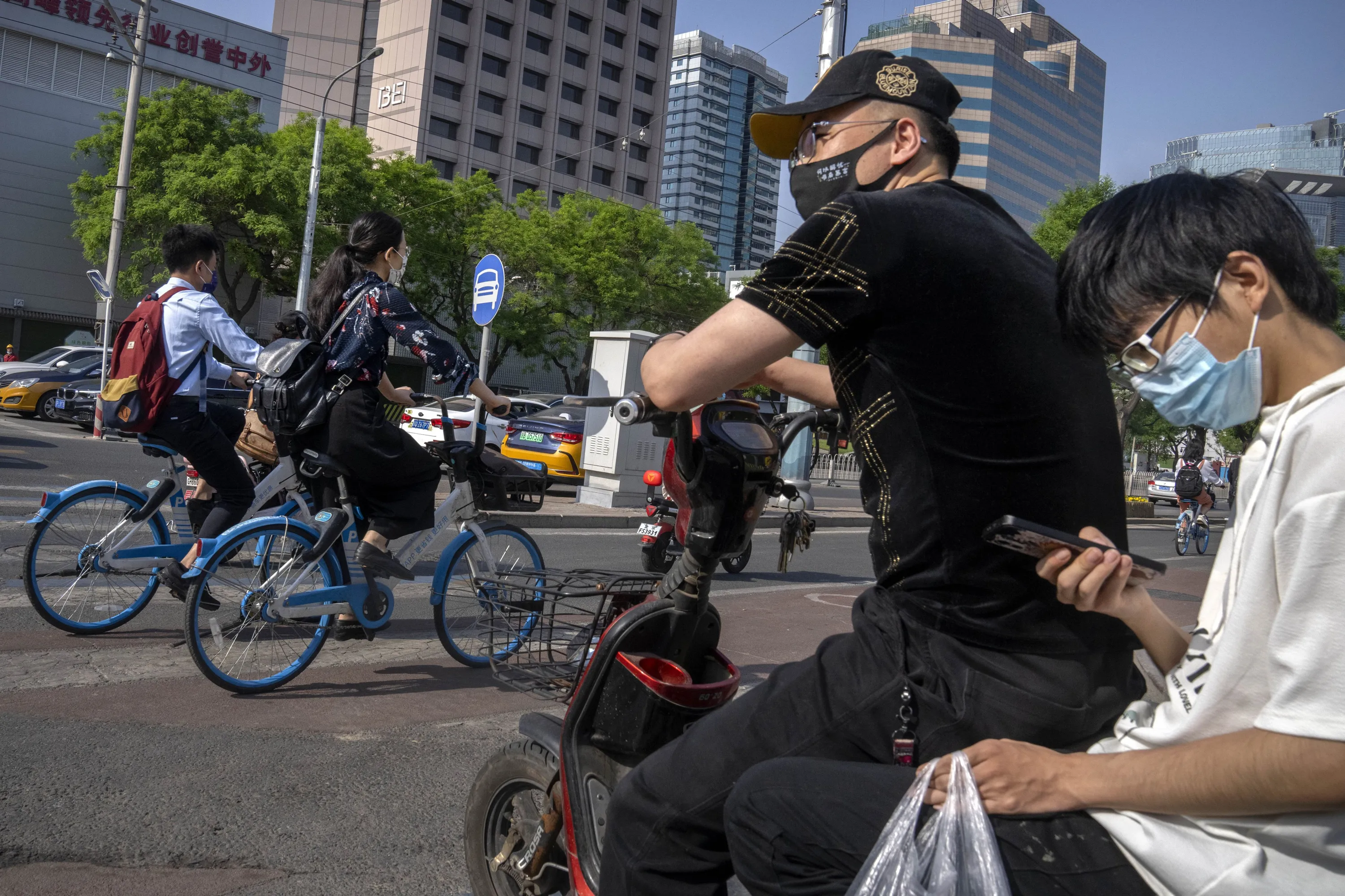 Commuters wearing face masks wait at an intersection in the central business district in Beijing, Thursday, May 5, 2022. (Photo by Mark Schiefelbein/AP Photo)