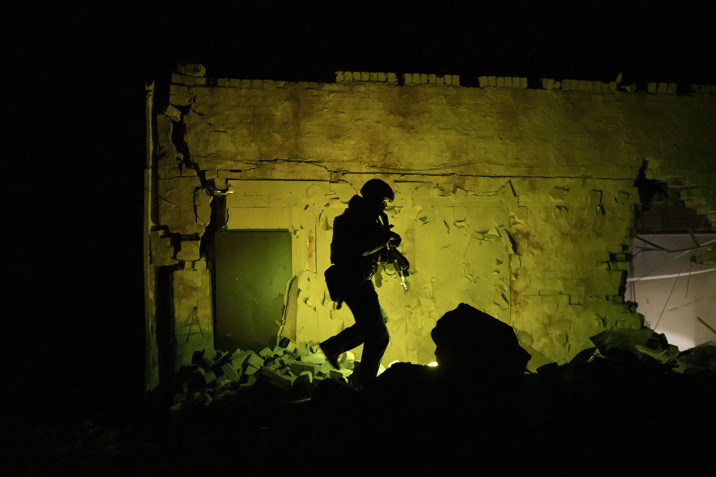 A Ukrainian special police officer walks next to a destroyed building as he patrols during night curfew in Kharkiv, Ukraine, Sunday, March 27, 2022. (Photo by Felipe Dana/AP Photo)