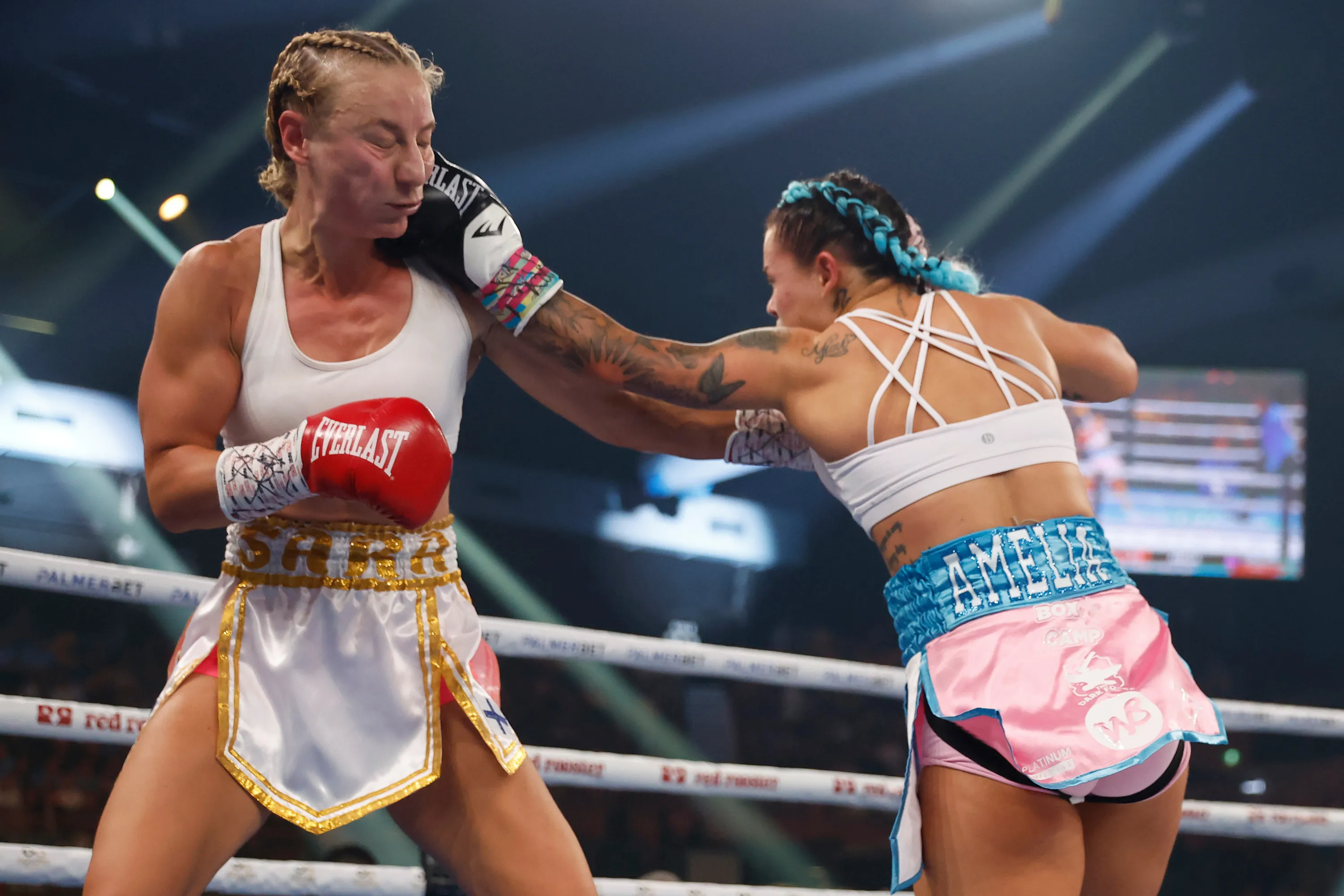 Amber Amelia (R), throws a punch during the Welterweight bout between Amber Amelia and Sara Jalonen as part of the King of the Castle Fight Night at Newcastle Entertainment Centre on May 11, 2022 in Newcastle, Australia. (Photo by Mark Evans/Getty Images)