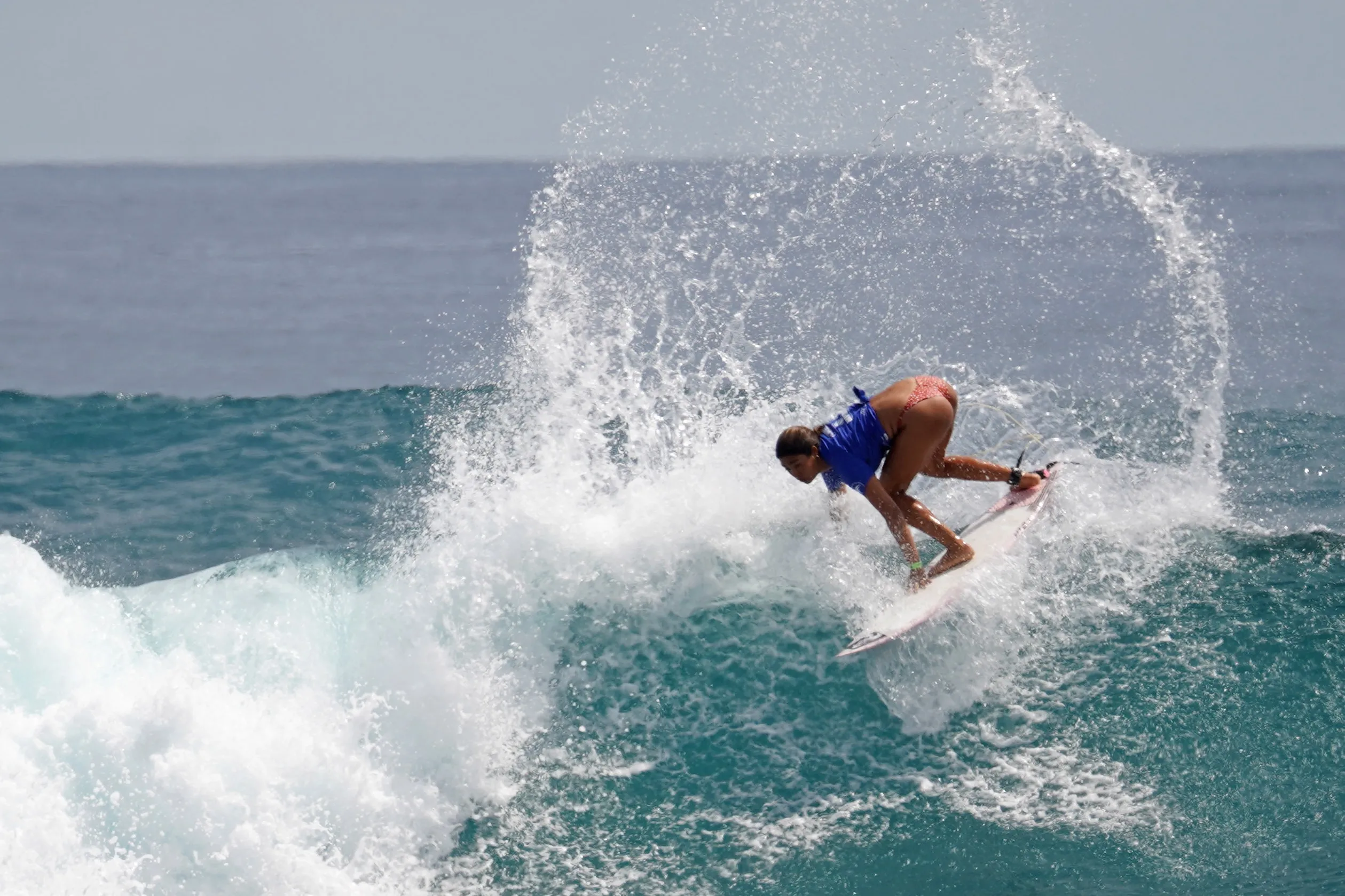 Peruvian surfer Sol Aguirre performs during the World Surf League (WSL) Qualifying Series Copa Sails of Change Galapagos, in Tongo Reef beach, San Cristobal island, in the Galapagos archipelago, Ecuador, on May 7, 2022. (Photo by Kevin Moncayo/Federación Ecuatoriana de Surf/AFP Photo)