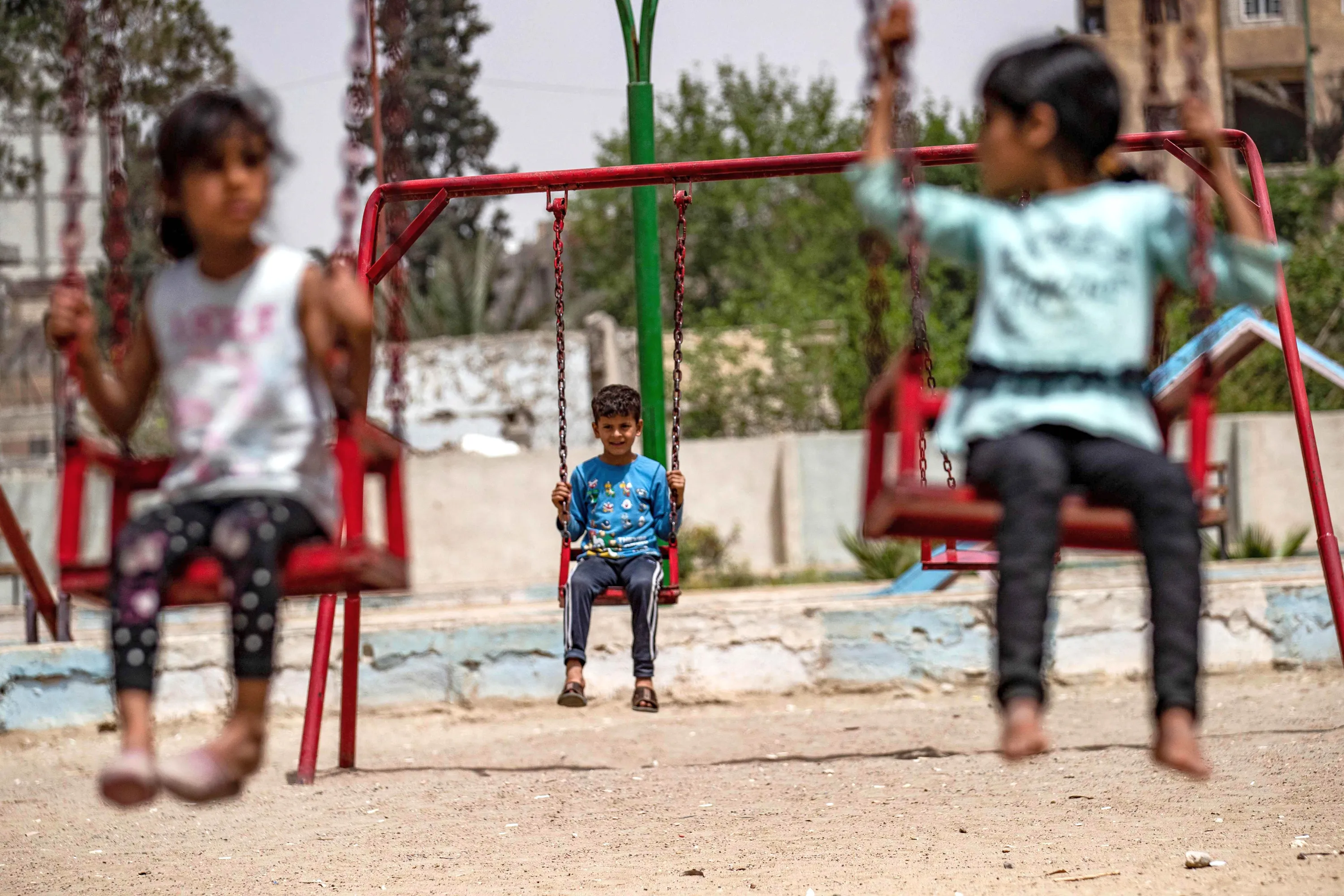 Syrian children play in a refurbished playground in the northern city of Raqa on April 30, 2022. (Photo by Delil Souleiman/AFP Photo)