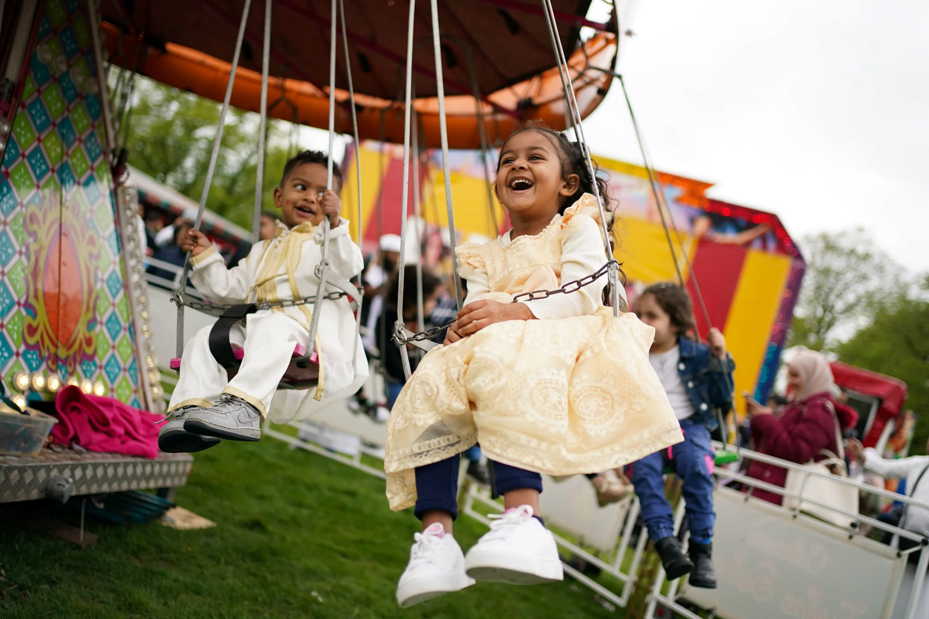 Children enjoy theme park rides at a funfair at Small Heath Park in Birmingham on Monday, May 2, 2022, as the holy month of Ramadan comes to an end and Muslims celebrate Eid al-Fitr. (Photo by Jacob King/PA Wire)