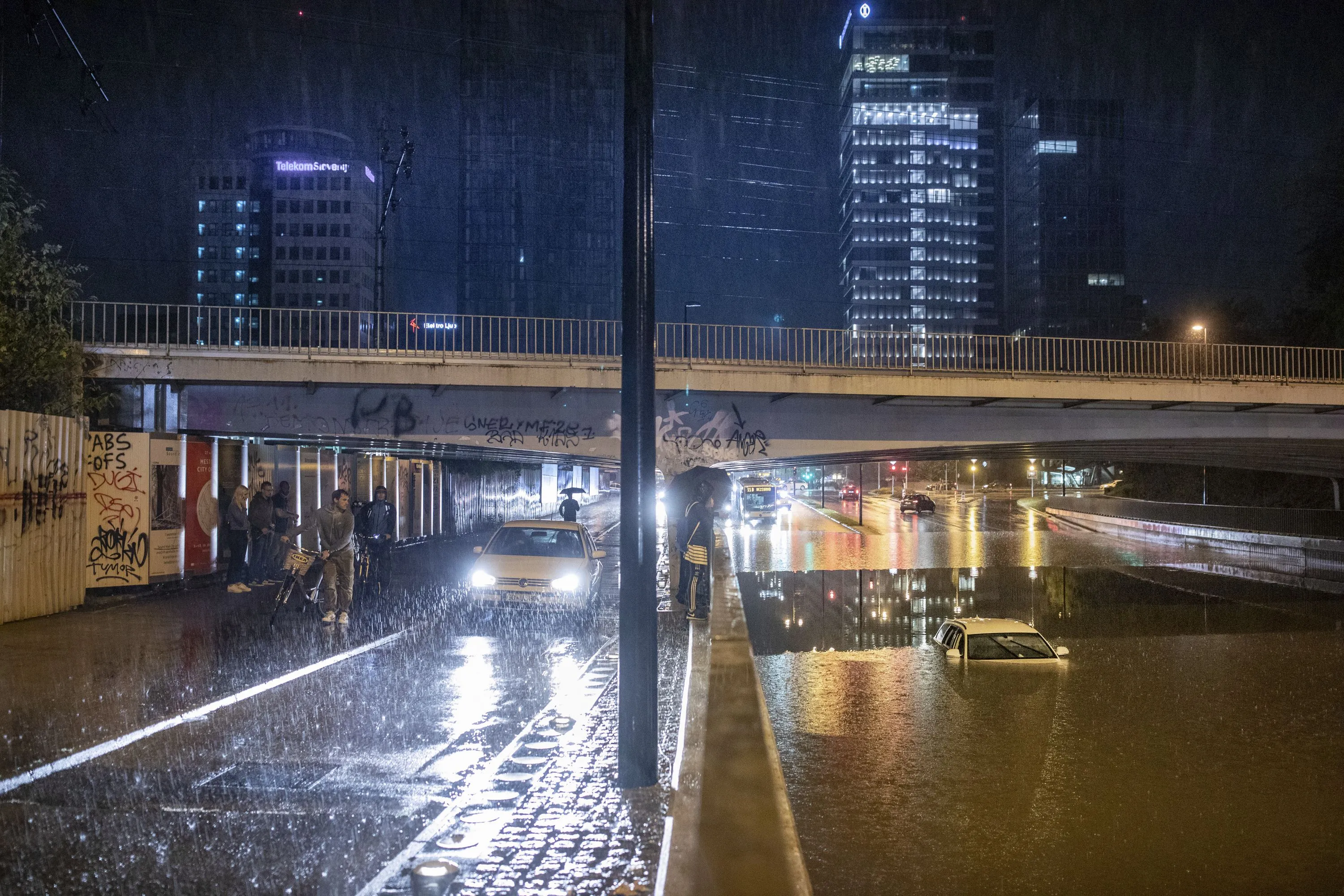 A car is submerged in flooding water in Ljubljana, Slovenia, late Wednesday, September 29, 2021. Huge rainfall in Slovenia has caused floods in the capital Ljubljana, interrupting a theatre show and forcing hundreds of interventions by emergency crews. Firefighters said Thursday that the situation overnight was unprecedented because huge quantities of rain fell within a short period of time. (Photo by AP Photo/Stringer)
