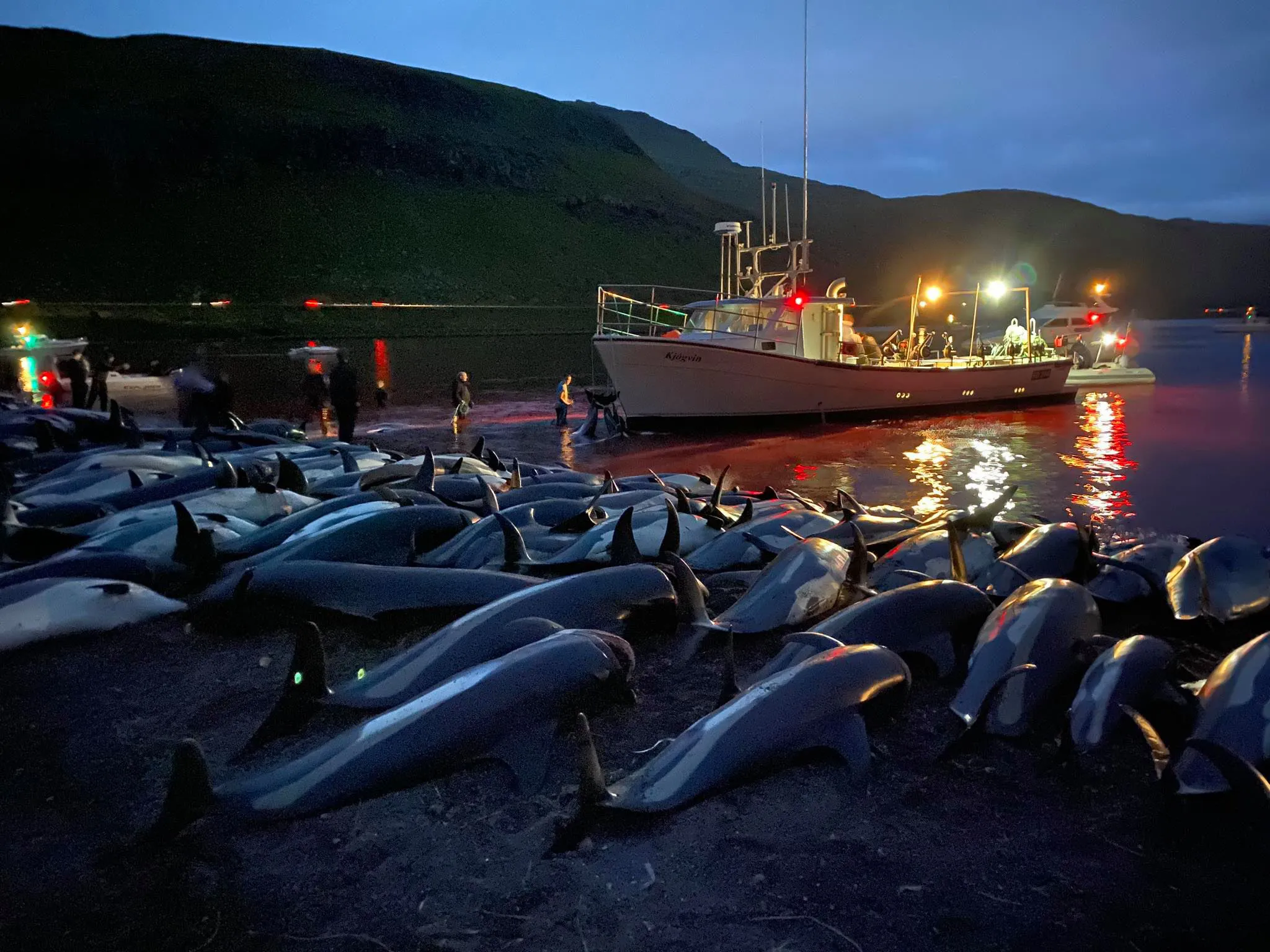 In this image released by Sea Shepherd Conservation Society the carcasses of dead white-sided dolphins lay on a beach after being pulled from the blood-stained water on the island of Eysturoy which is part of the Faeroe Islands Sunday September 12, 2021. The dolphins were part of a slaughter of 1,428 white-sided dolphins that is part of a four-century-old traditional drive of sea mammals into shallow water where they are killed for their meat and blubber. The hunt in the North Atlantic islands is not commercial and is authorized, but environmental activists claim it is cruel. (Photo by Sea Shepherd via AP Photo)