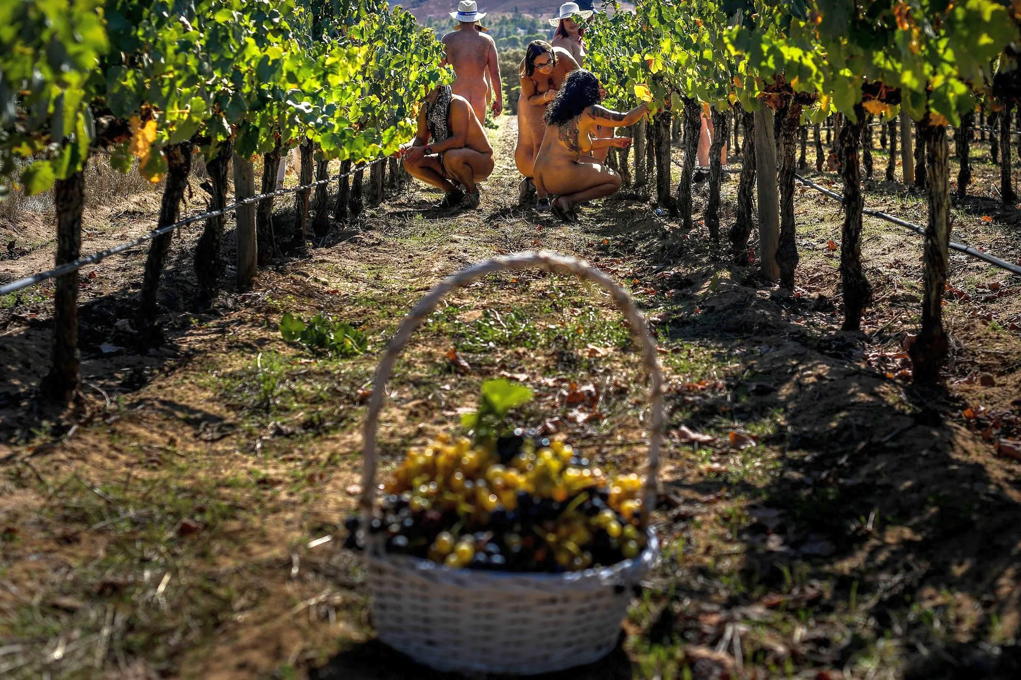 A group of naked people take part in a nudist grape harvesting in a vineyard of the Herdade Canal Caveira winery in Grandola, Alentejo, south of Portugal, on September 19, 2021. (Photo by Patricia de Melo Moreira/AFP Photo)
