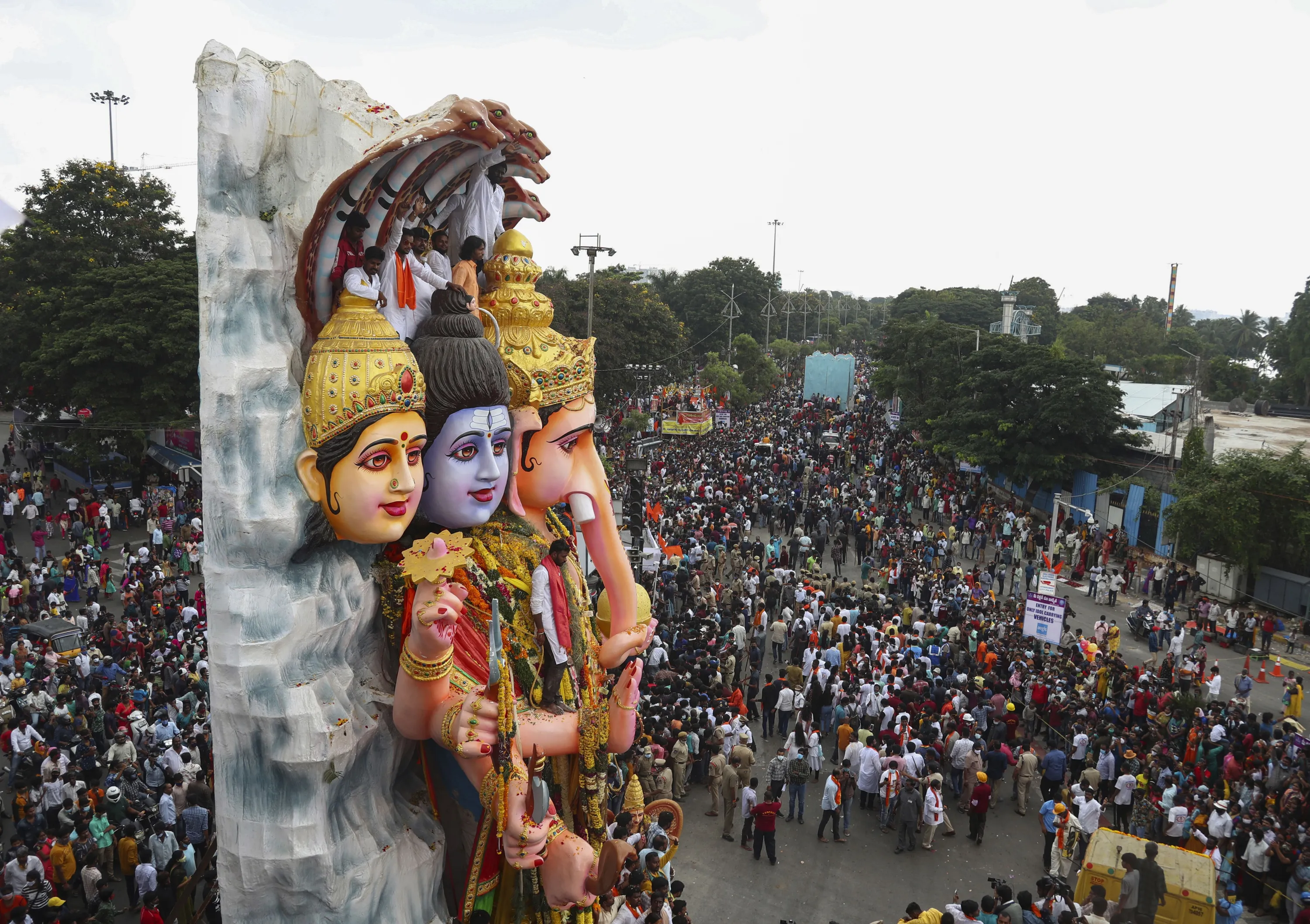 A giant idol of elephant-headed Hindu god Ganesha is taken in a procession for immersion in the Hussain Sagar Lake on the final day of Ganesh Chaturthi festival in Hyderabad, India, Sunday, September 19, 2021. (Photo by Mahesh Kumar A./AP Photo)
