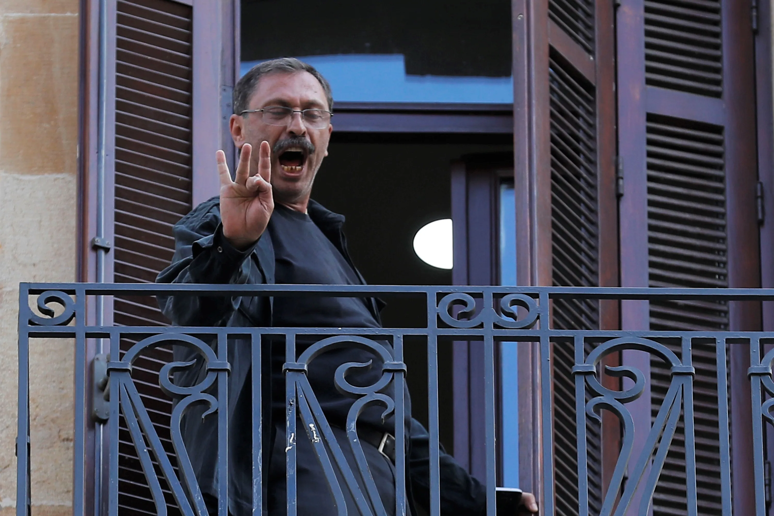 An unidentified man standing on the balcony of a bank headquarters, gestures with his middle finger to Lebanese protesters in Beirut, Lebanon, Friday, September 24, 2021. Dozens of Lebanese depositors protested throwing eggs and tomatoes on a number of private banks in central Beirut, demanding to have access to their deposits which have been blocked under informal capital controls since the country's financial and economic crisis began in late 2019. (Photo by Hussein Malla/AP Photo)