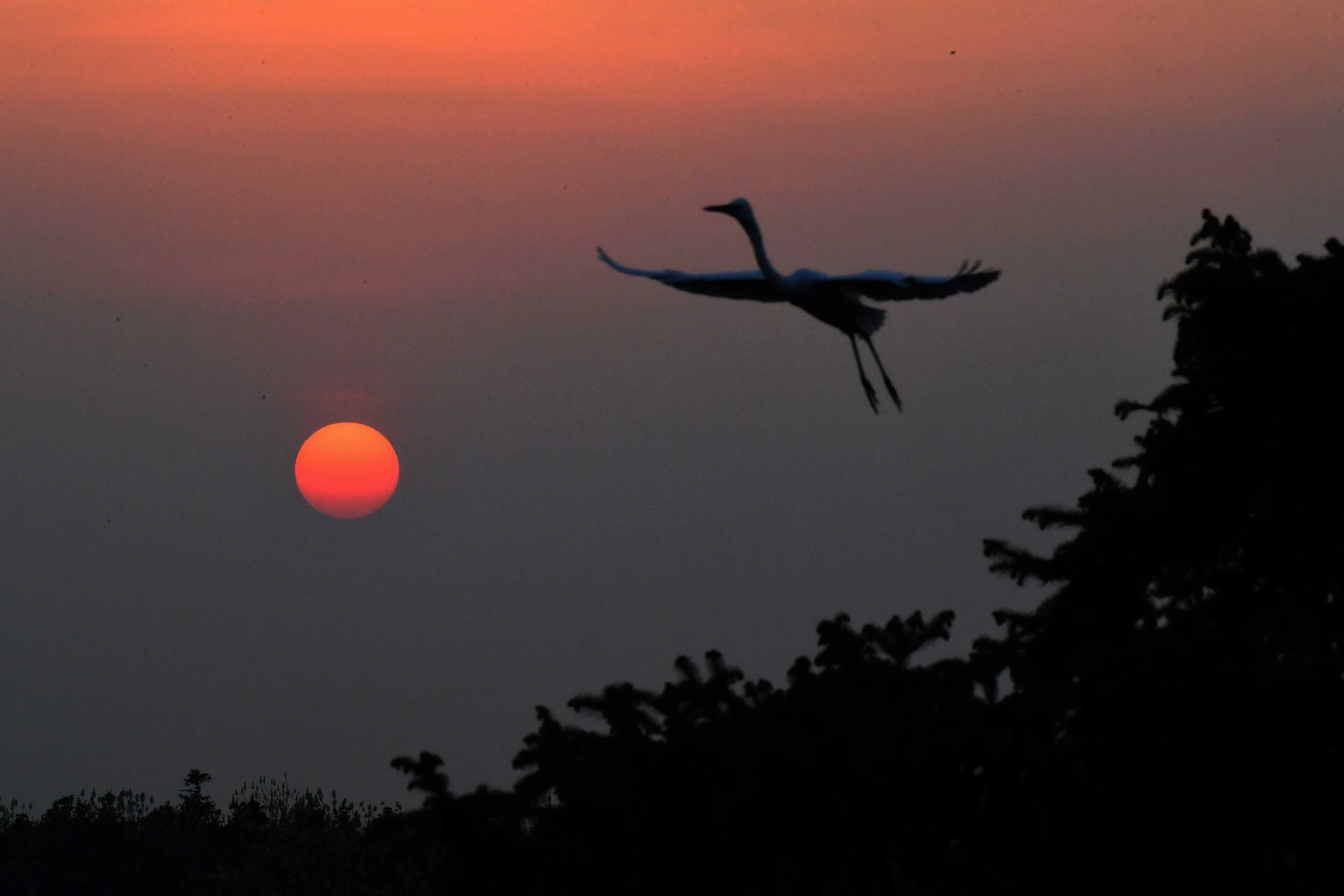 Photo taken on March 15, 2022 shows an egret flying against sunset at Xiangshan forest park in Xinjian District of Nanchang, east China's Jiangxi Province. Xiangshan in East China's Jiangxi, dubbed as the “egret kingdom”, a habitat where large flocks of egrets migrate to nest and breed during their breeding season each year. The population of the migrant bird has increased as efforts are enhanced to protect the habitat that is now a hot spot for photographers and bird observers. (Photo by Xinhua News Agency/Rex Features/Shutterstock)
