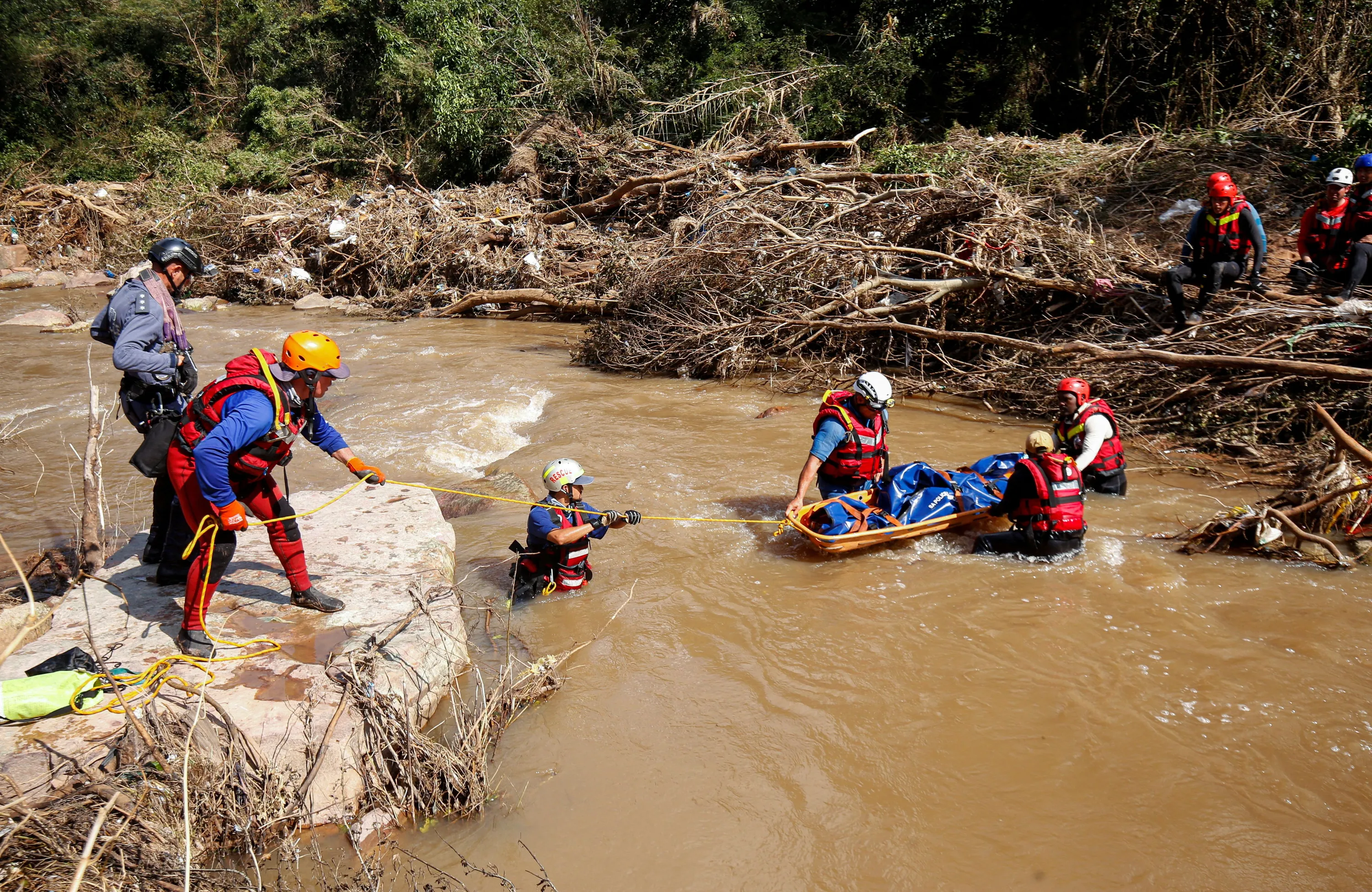 A search and rescue team prepares to airlift a body from the Mzinyathi River after heavy rains caused flooding near Durban, South Africa, April 19, 2022. (Photo by Rogan Ward/Reuters)